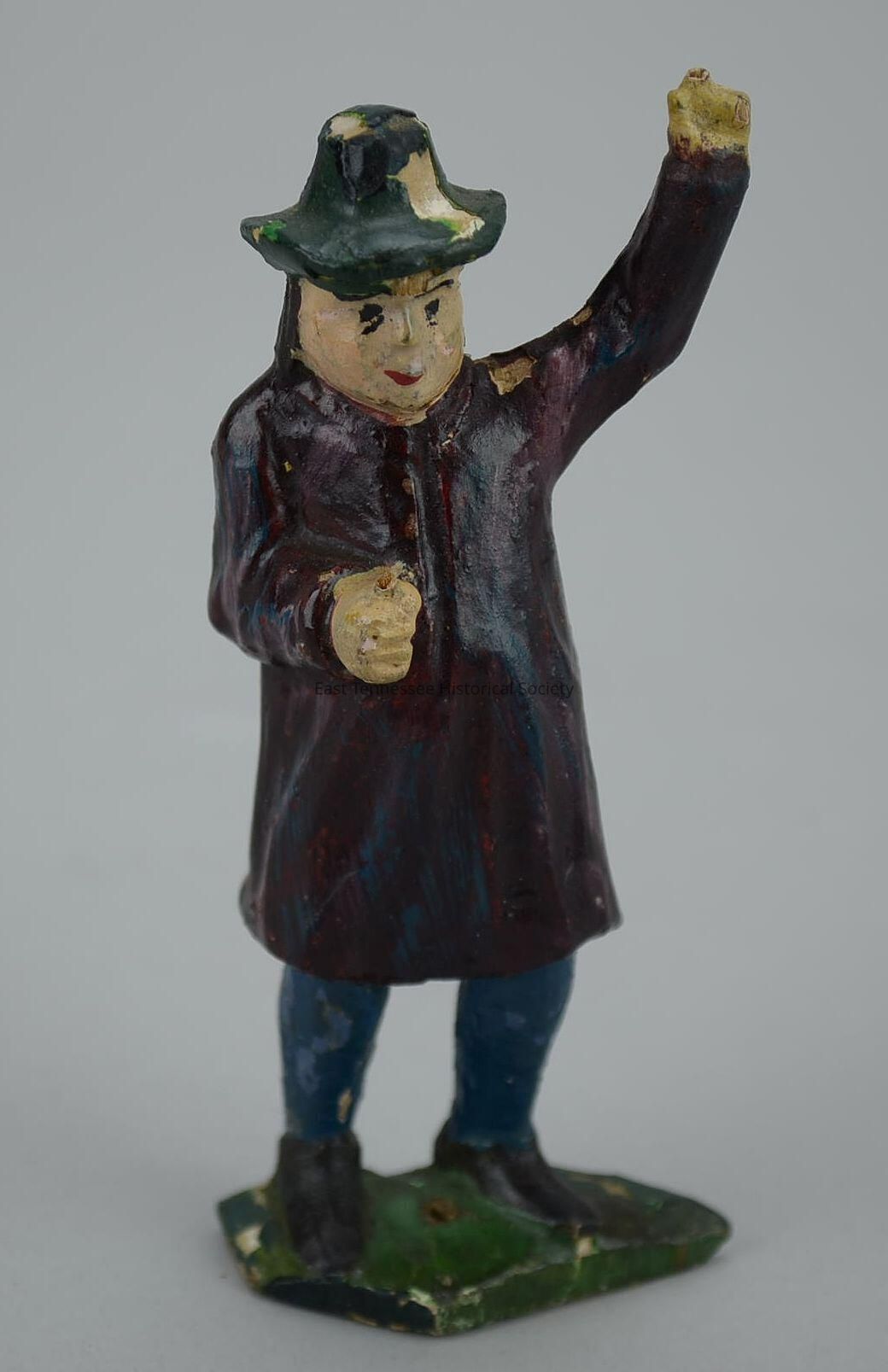Carved standing male figure, painted wood, left arm raised and right arm bent 45 degrees at side, wears green wide-brim hat, black hair/eyebrows, red mouth, purple knee-length tunic/coat, blue stockings, black shoes, green base, made by Fickey family (Germany), 4 5/16"h x 1 3/4"w x 1 1/16"d, 1780-1880.Made/Created