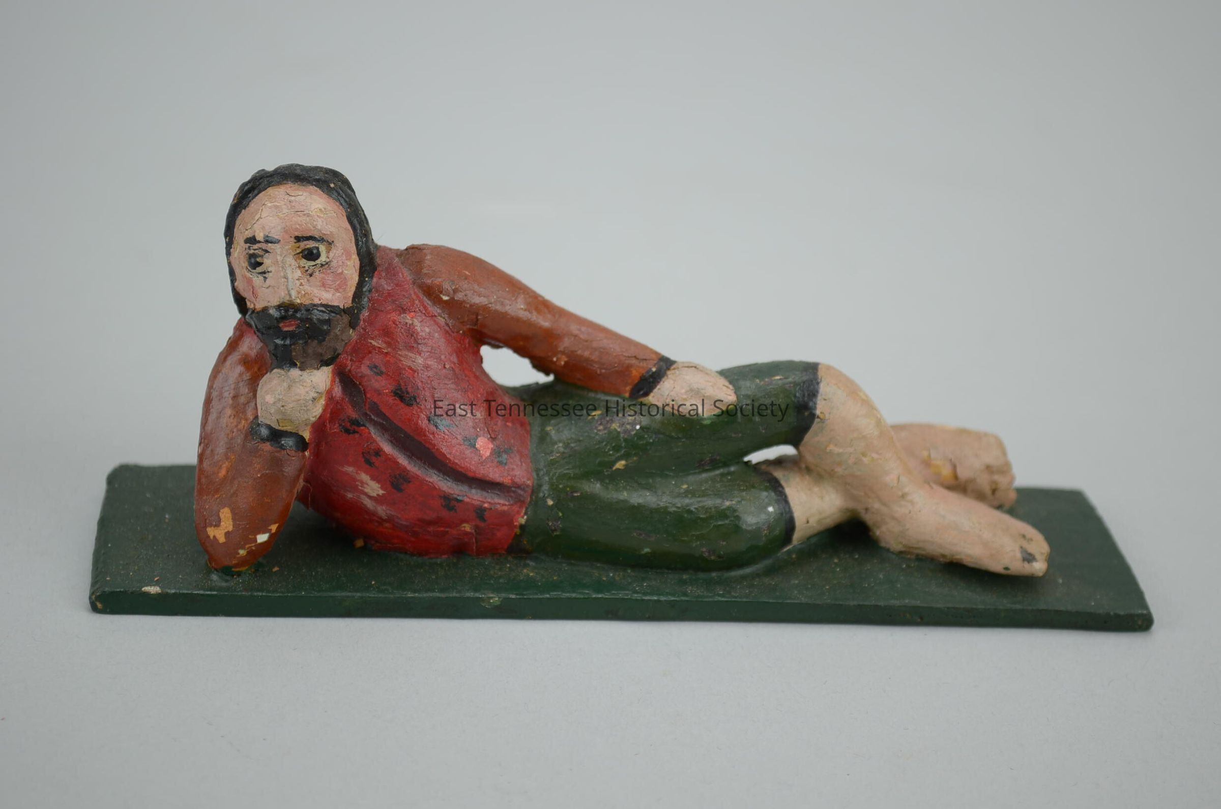 Carved reclined male figure, painted wood, chin rests on right hand and legs crossed, black hair/eyebrows/eyes, pink cheeks, red mouth, black beard, red jacket with brown sleeves/black buttons and trim, green breeches with black cuffs, bare lower legs and feet, green base, made by Fickey family (Germany), 2 3/8"h x 6"w x 1 1/2"d, 1780-1880.Made/Created
