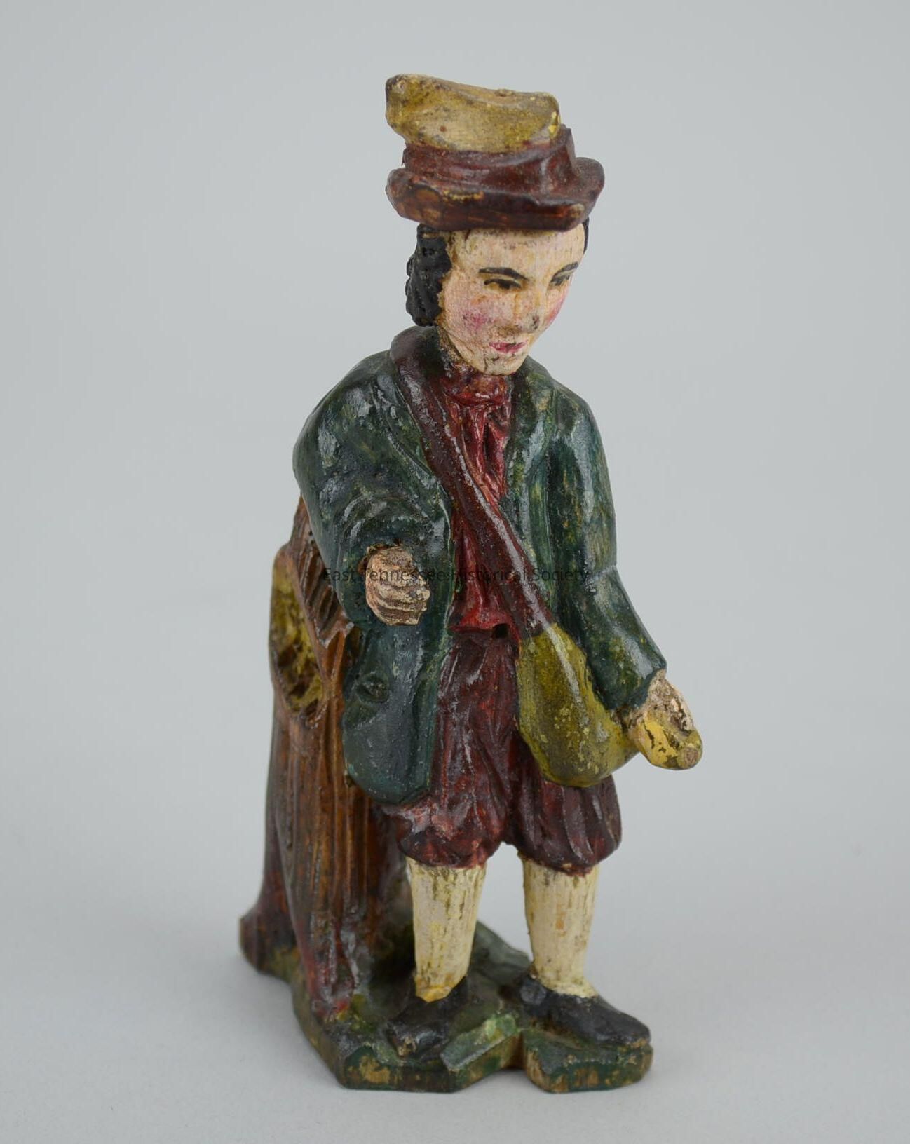 Carved standing male figure, painted wood, leans against brown tree trunk, wears mustard-color hat with wide brown brim and carrying yellow-green bag with brown strap over right shoulder and left hip, black (collar length) hair/eyebrows/eyes, pale face, pink cheeks, red mouth, dark-green jacket, maroon shirt, burgundy breeches, white stockings, black shoes, green base, made by Hickey family (Germany), 5 1/4"h x 2 5/8"w x 1 7/16"d.Made/Created