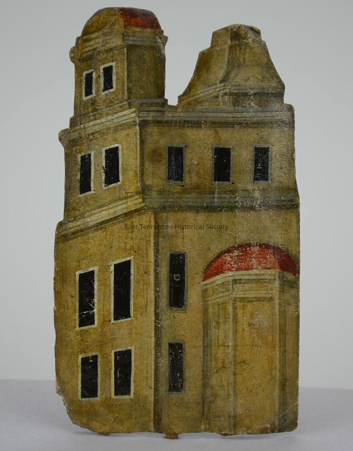 Backdrop, painted cardstock/hard paper, three-quarter view of two-story building with roof cupola, blacked out windows, red roof sections in front an on top, gold/tan in color, sheet music between wood support slats on reverse, slats with points at one end for mounting, made by Hickey family, 7 1/4"h x 3 11/16"w x 1/8"d, 1730-1880.Made/Created