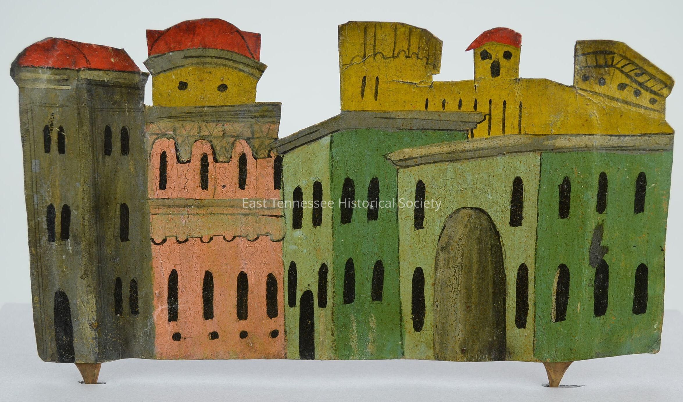 Backdrop, painted cardstock/hard paper, scene of four buildings; from left-gray three-story tower with red roof, coral color two-story building with Tudor trim and red-roofed gold tower, green two-story third and fourth block buildings, gold color castle wall in background, made by Hickey family (Germany), 5 3/4"h x 10"w x 3/16"d, 1730-1880.Made/Created