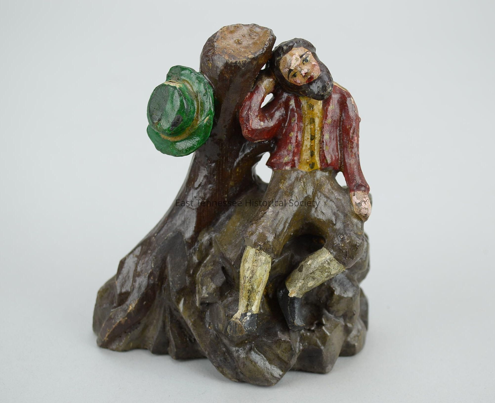 Carved male figure, painted wood, sits on carved rock/tree trunk base, hand tilted to right and supported by right hand, black eyebrows/eyes, black eyebrows/eyes, pink cheeks, red mouth, black Amish-style beard, mustard-brown shirt with brown buttons, dark-red jacket with gold buttons, brown breeches, gray stockings, black shoes, green wide-brim hat with gold band hanging on side of tree, made by Fickey family (Germany), 4 7/16"h x 3 15/16"w x 2 9/16"d, 1780-1880.Made/Created