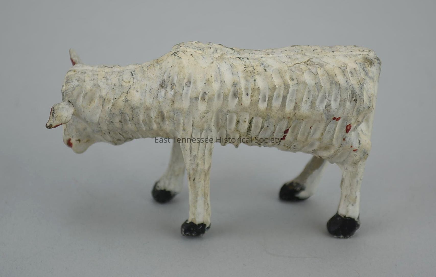 Carved sheep, white painted wood, head straight/slightly lowered, dimpled fleece with symmetrical pattern, groove runs length of spine, red mouth/nose/ears, black eyes and surrounds, black hooves, made by Hickey family (Germany), 1 29/32"h x 1 5/16"w x 2 1/8"d, 1730-1880.Made/Created