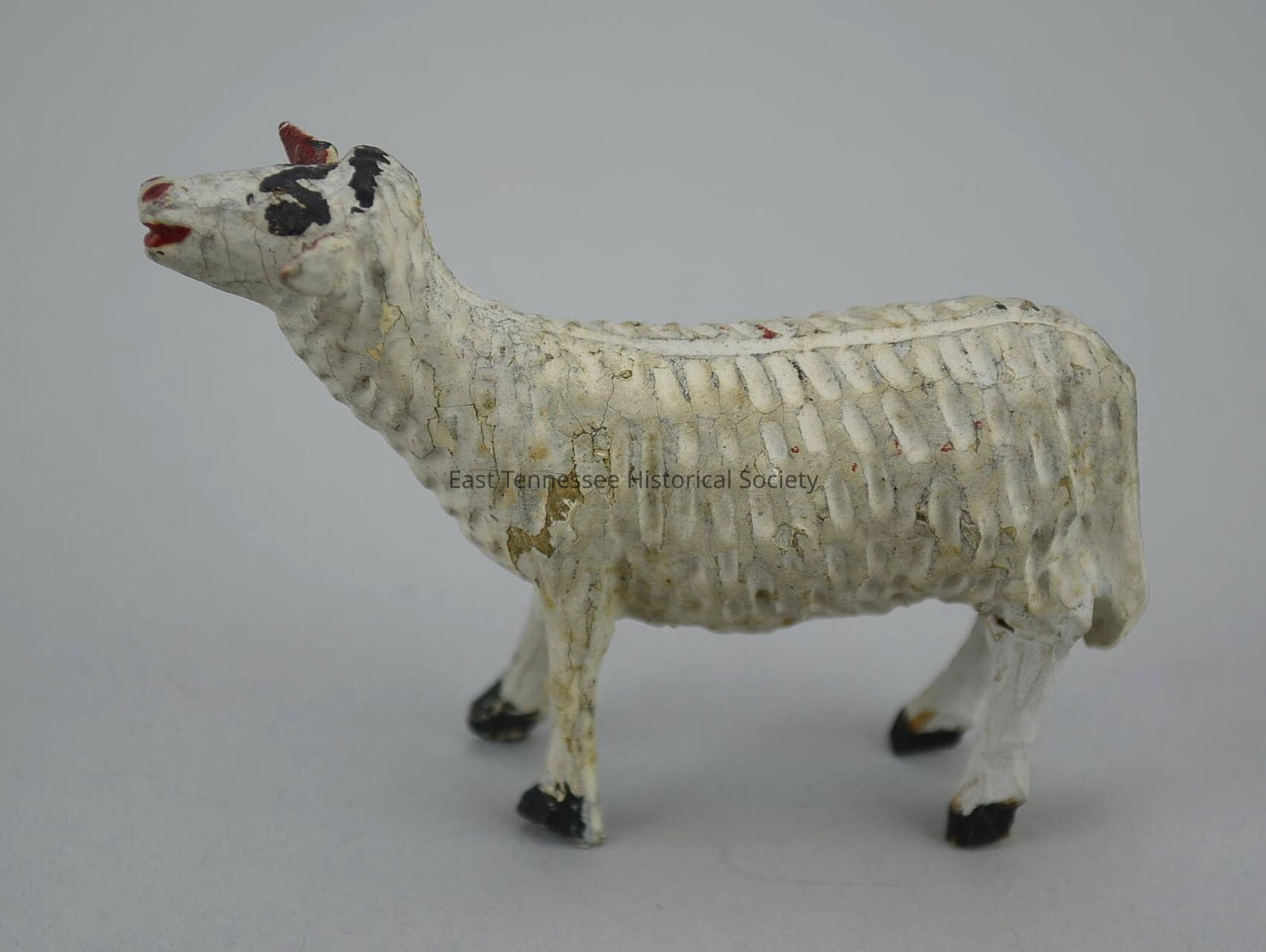 Carved sheep, white painted wood, head straight and raised (as to bleat), dimpled fleece with symmetrical pattern, groove runs along length of spine, black eyes, V-shaped brow/brow ridge, red mouth/nose/ears, black hooves, front hooves pointed in (pigeon toed), made by Hickey family (Germany), 2 5/16"h x 1 3/32"w x 3 1/16"d, 1730-1880.Made/Created
