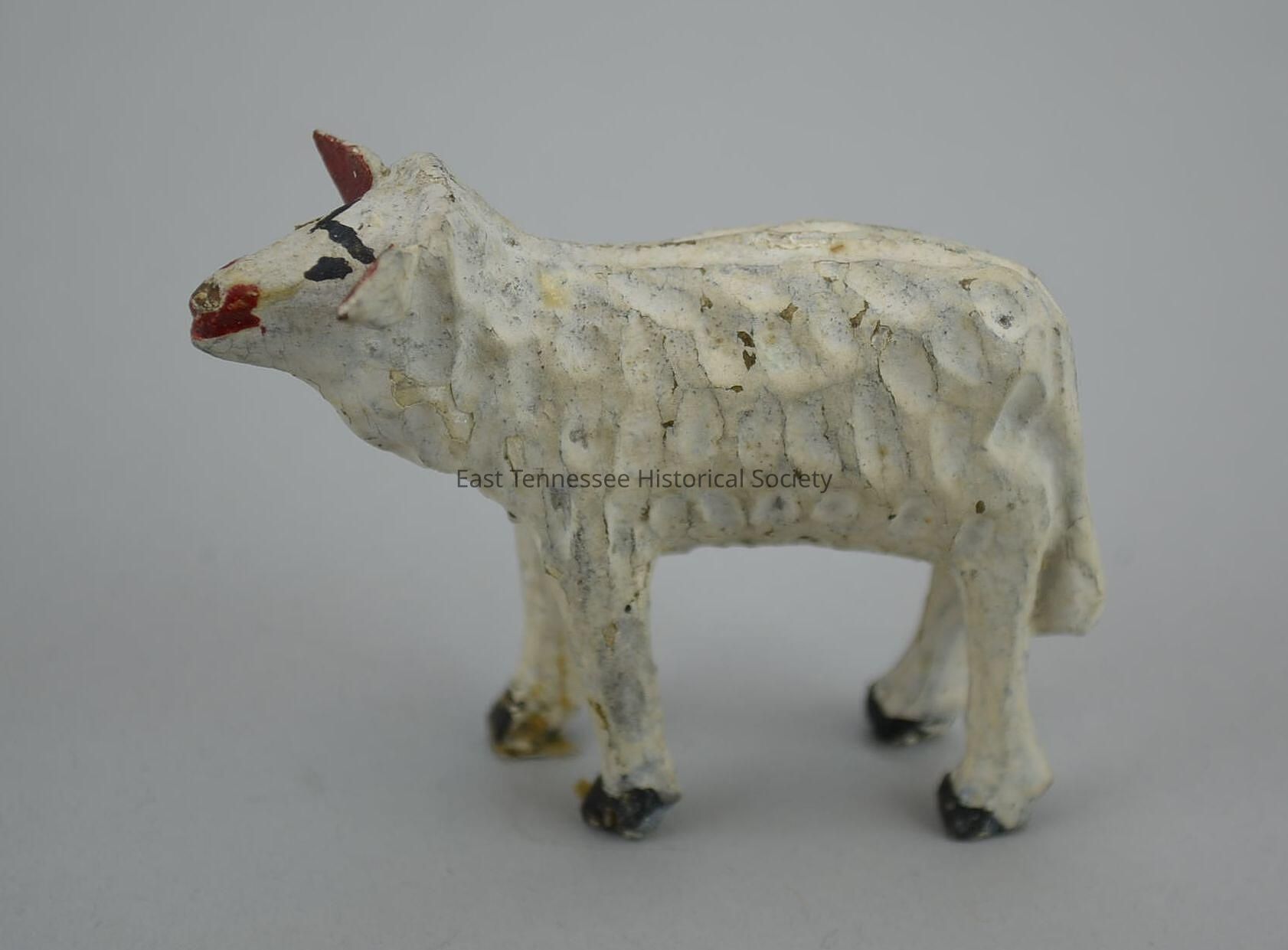 Carved sheep, white painted wood, head positioned up and slightly to left, dimpled fleece (large dimples) with alternating pattern, groove along length of spine, black eyes, V-shaped brow, red mouth/nose/ears, black hooves, made by Hickey family (Germany), 2 1/4"h x 1 1/8"w x 2 11/16"d, 1730-1880.Made/Created
