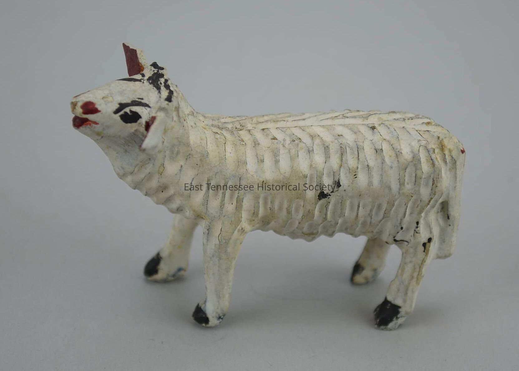 Carved sheep, white painted wood, head forward and raised (as to bleat) slightly to left, dimpled fleece with symmetrical pattern, groove runs length of spine, black eyes/eyebrows/brow ridge, red mouth/nose/ears, black hooves, made by Hickey family (Germany), 1 7/8"h x 1 5/16"w x 2 3/4"d, 1730-1880.Made/Created