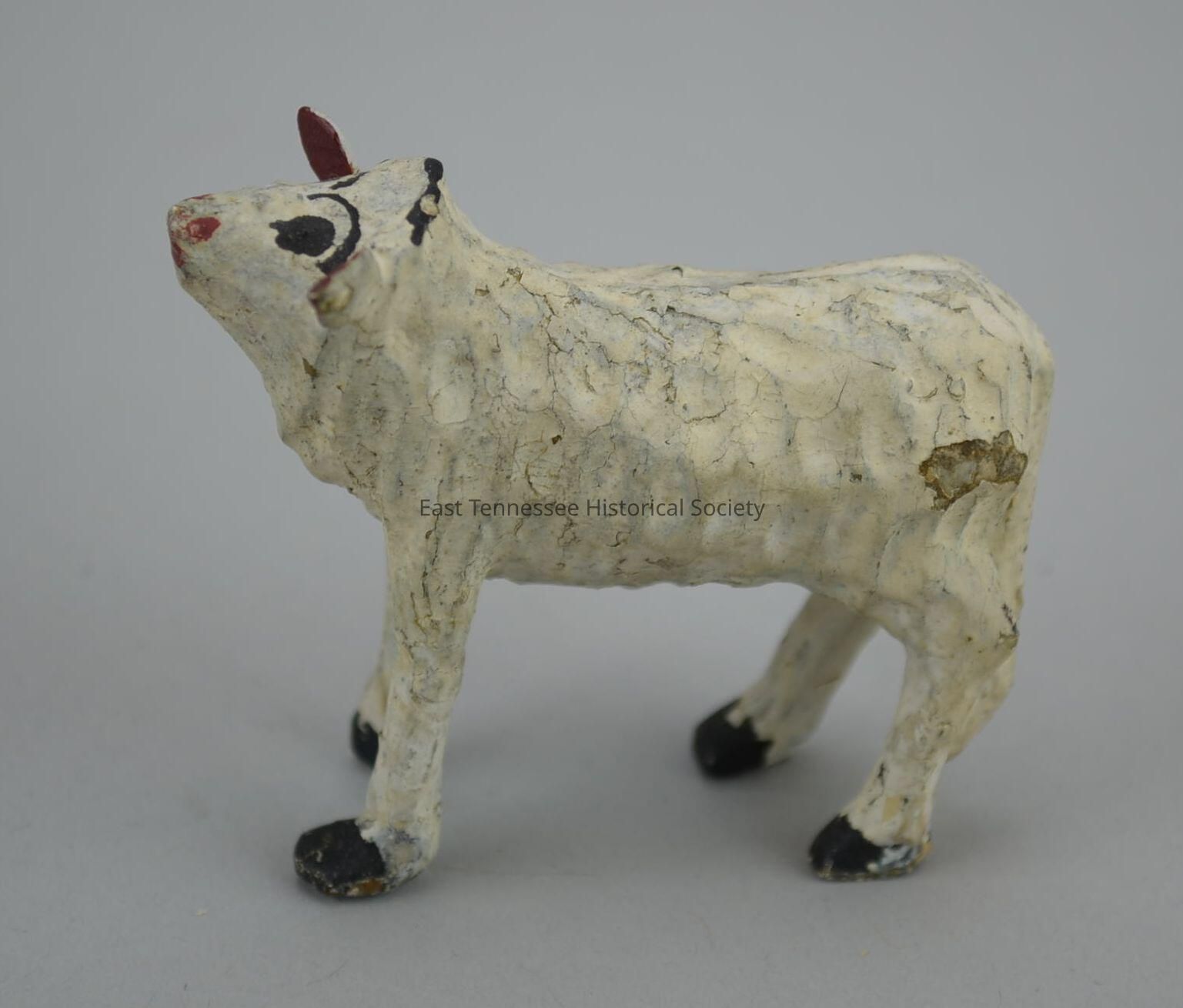 Carved sheep, white painted wood, head straight and raised (as to bleat), dimpled fleece with symmetrical pattern, large shallow dimples, black eyes/eyebrows/brow ridge, shallow groove along spine, red mouth/nose/ears, black hooves, made by Hickey family (Germany), 2 3/16"h x 1 1/8"w x 2 19/32"d, 1730-1880.Made/Created