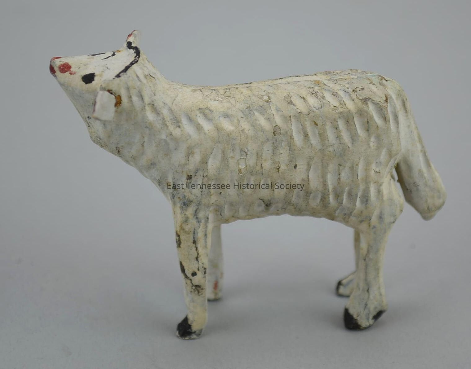 Carved sheep, white painted wood, head forward/raised/slightly to right, dimpled fleece with symmetrical pattern, groove runs along spine, black eyes/right brow/brow ridge, red mouth/nose/ears, black hooves, made by Hickey family (Germany), 2 1/4"h x 1 1/4"w x 2 7/8"d, 1730-1880.Made/Created