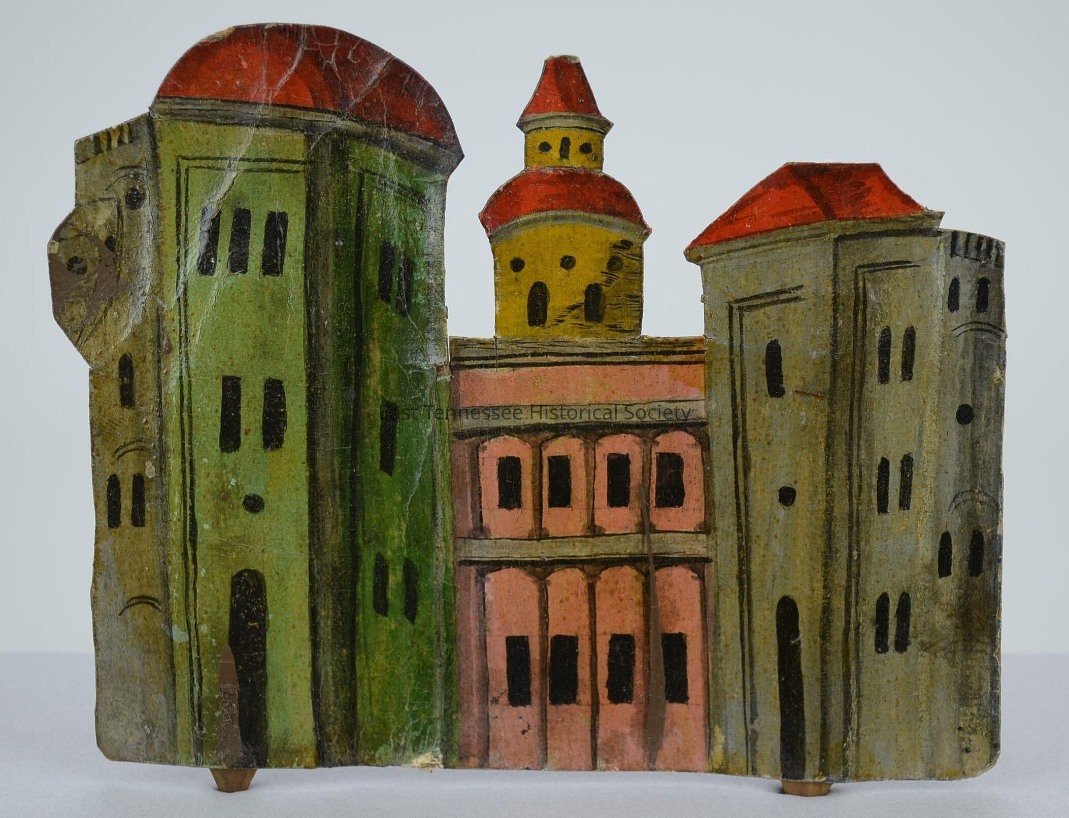 Backdrop, painted cardstock/hard paper, scene of three buildings; from left-green three-story tower with red roof, black windows and door, center-pink two story with columned walks, behind center-gold tower with red roof, on right-three-story tower with red roof, greenish-brown in color, reverse-two wood support slats with points at one end for mounting, made by Hickey family (Germany), 6 1/2"h x 7 3/8"w x 3 1/6"d, 1730-1880.Made/Created