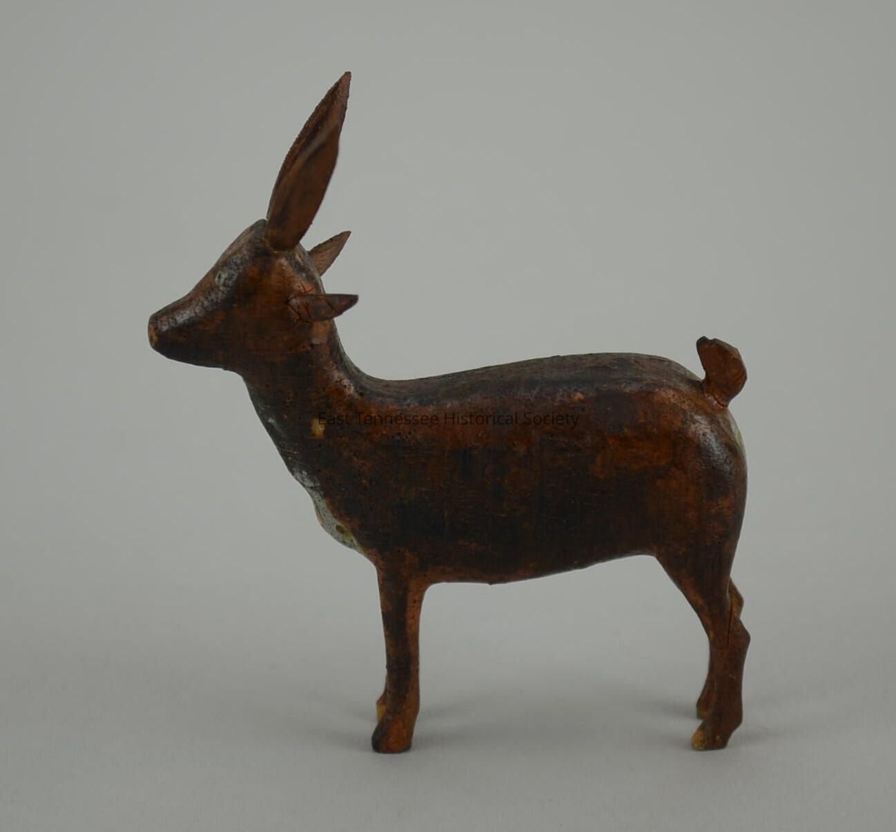 Carved antelope, orangish painted wood with black areas on top (more black on left side/more orange on right), white chest/blue-gray underside, ears point straight and back, antlers long and pointed almost straight up, eyes painted gray-blue with black pupils, short upward-curved tail, 3 1/8"h x 3/4"w x 2 5/8"d, date.Made/Created
