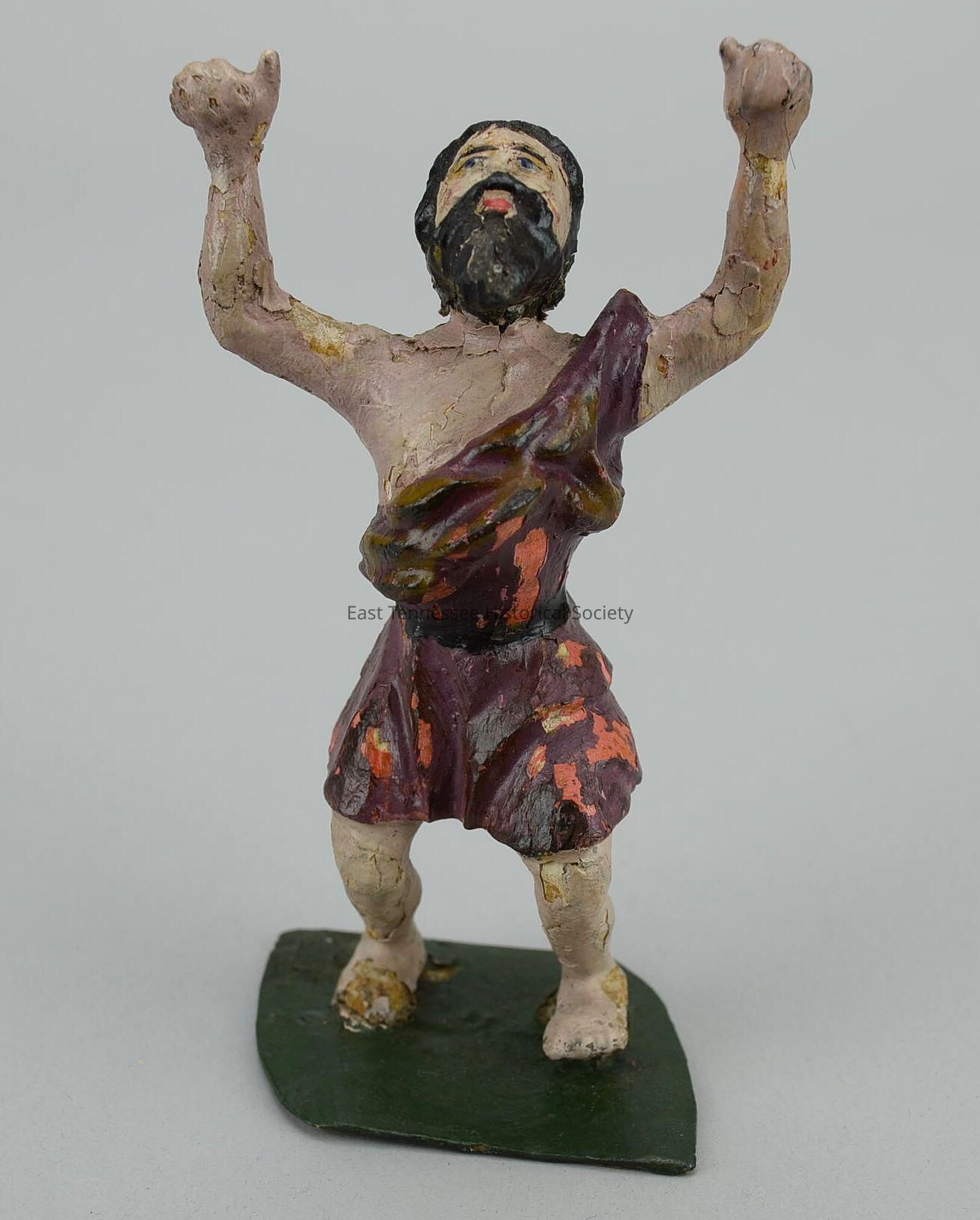 Carved male (Sampson-like) figure, painted wood, arms raised/hands clinched, long black hair and beard, black eyes and eyebrows, red mouth, purple biblical-style robe with left should bare, green base, made by Fickey family (Germany), 5 7/16"h x 3 1/16"w x 1 13/16"d, 1780-1880.Made/Created