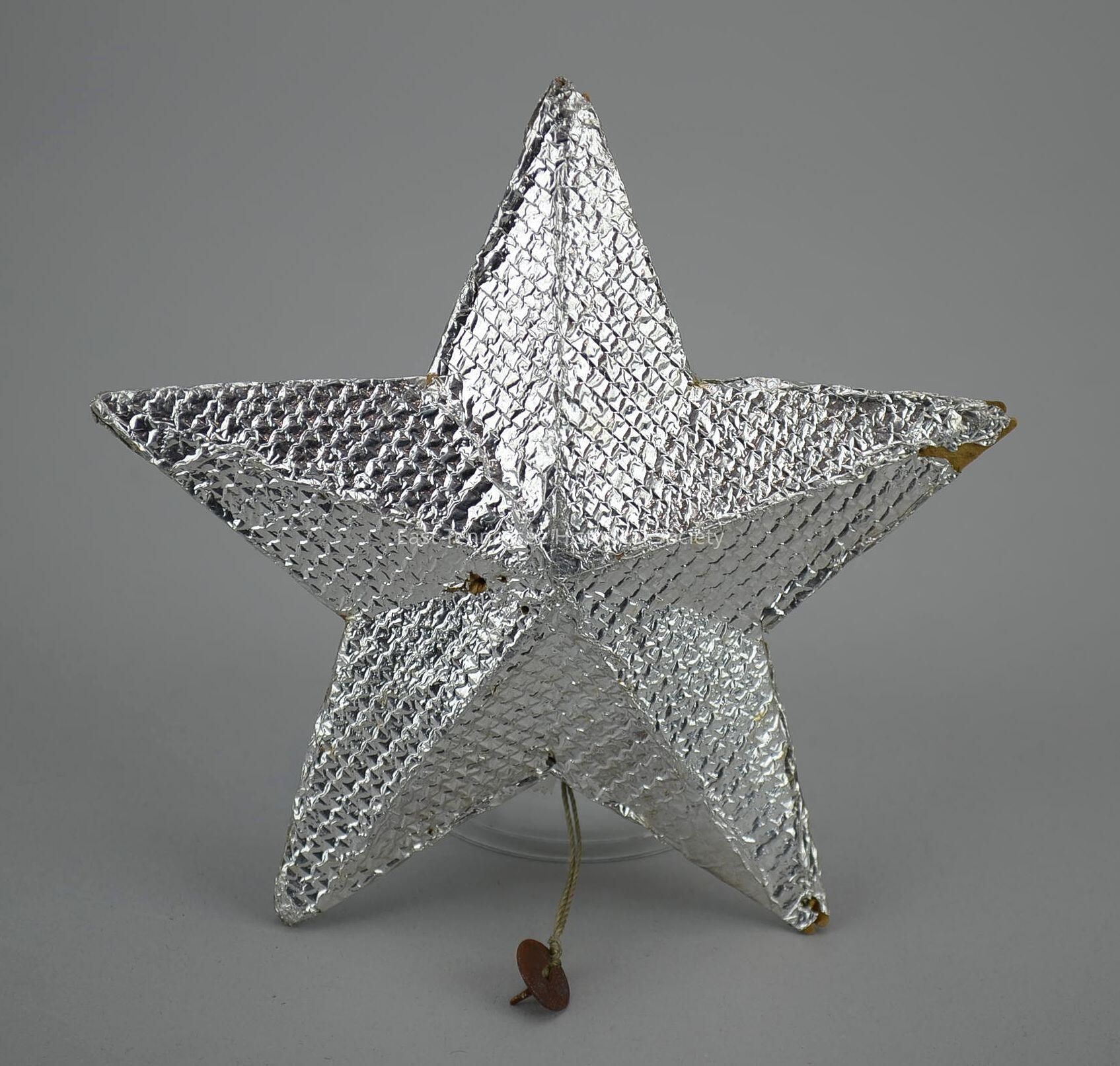 Star, five-pointed three-dimensional shape of cardboard covered with textured metal/aluminum foil, length of gray string tied to rusted thumbtack (length unknown) and taped to back, made by Fickey family (Germany), 4 11/16"h x 4 7/8"w x 1"d, 1780-1880.Made/Created