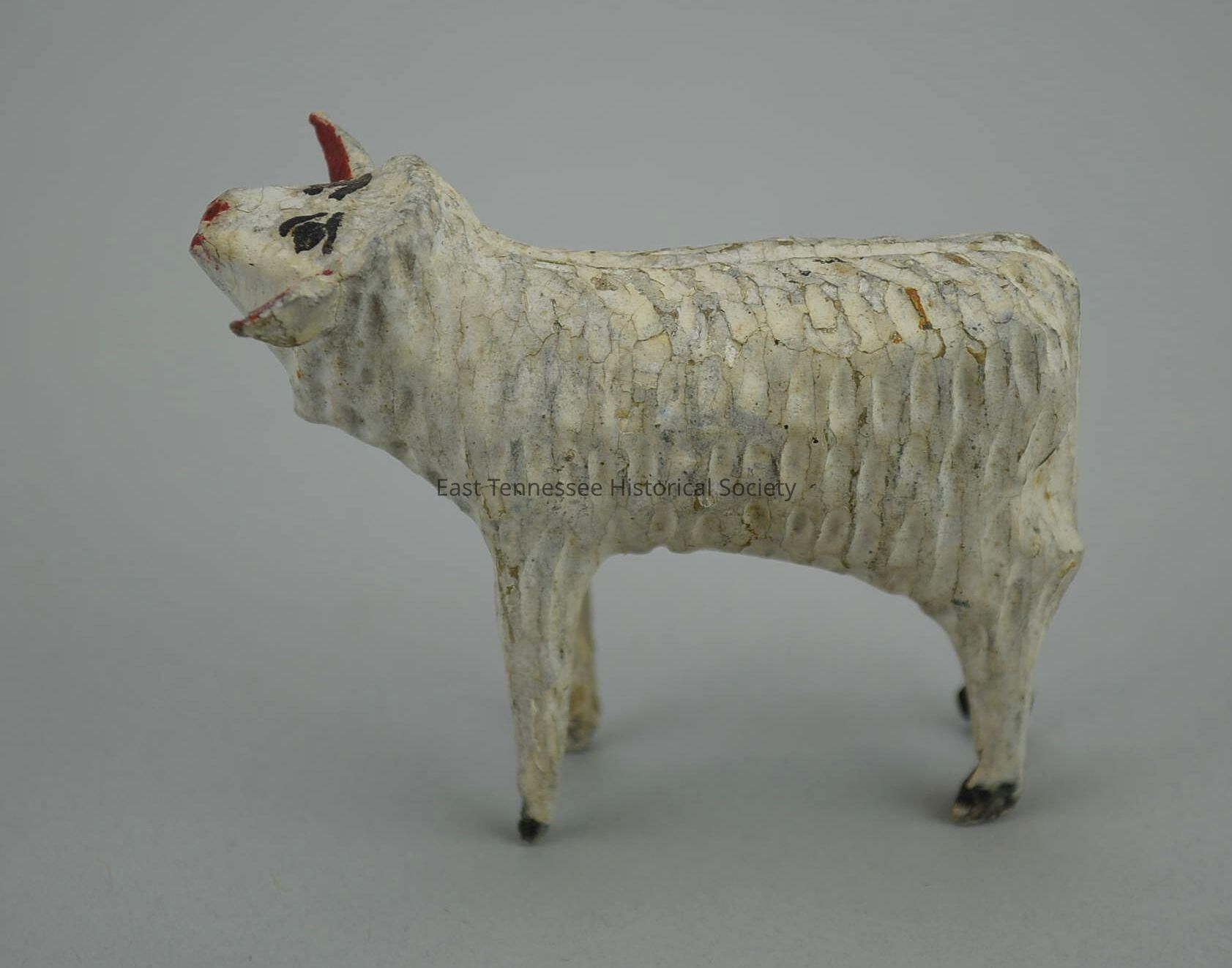 Carved sheep, white painted wood, head raised (as to bleat) slightly to right, dimpled fleece with short symmetrical vertical pattern, groove runs along spine, black eyes and surrounds, red mouth and nose, black hooves, made by Hickey family, 2 1/8"h x 1 3/16"w x 2 3/4"d, 1730-1880.Made/Created