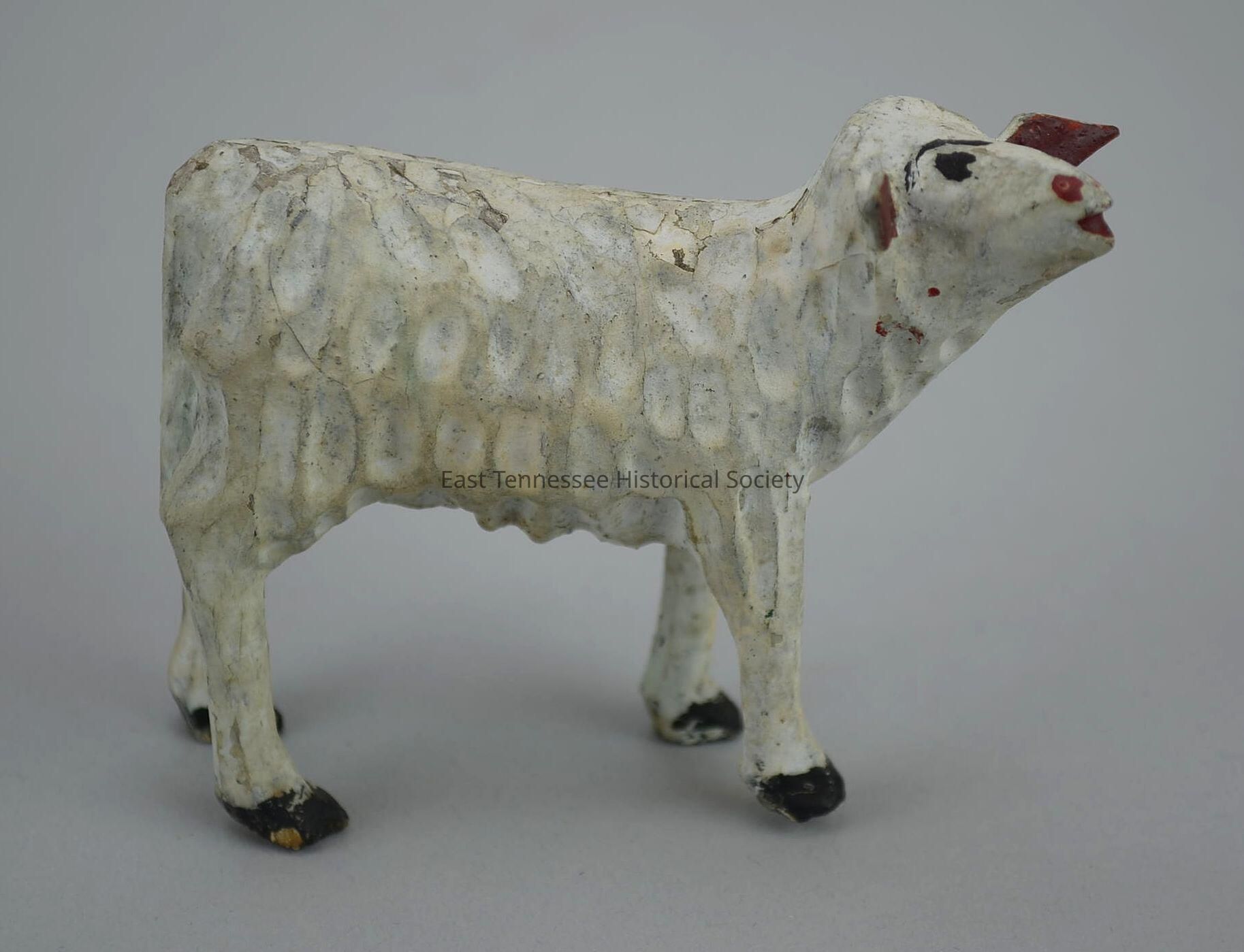 Carved sheep, white painted wood, head up (as to bleat) and turned to right approximately 20 degrees, black eyes/eyebrows, dimpled fleece with short symmetrical vertical pattern, groove runs length of spine, black eyes/eyebrow, red mouth/nose/ears, black hooves, made by Hickey family (Germany), 2 9/16"h x 1 1/4"w x 3 1/4"d, 1730-1880.Made/Created