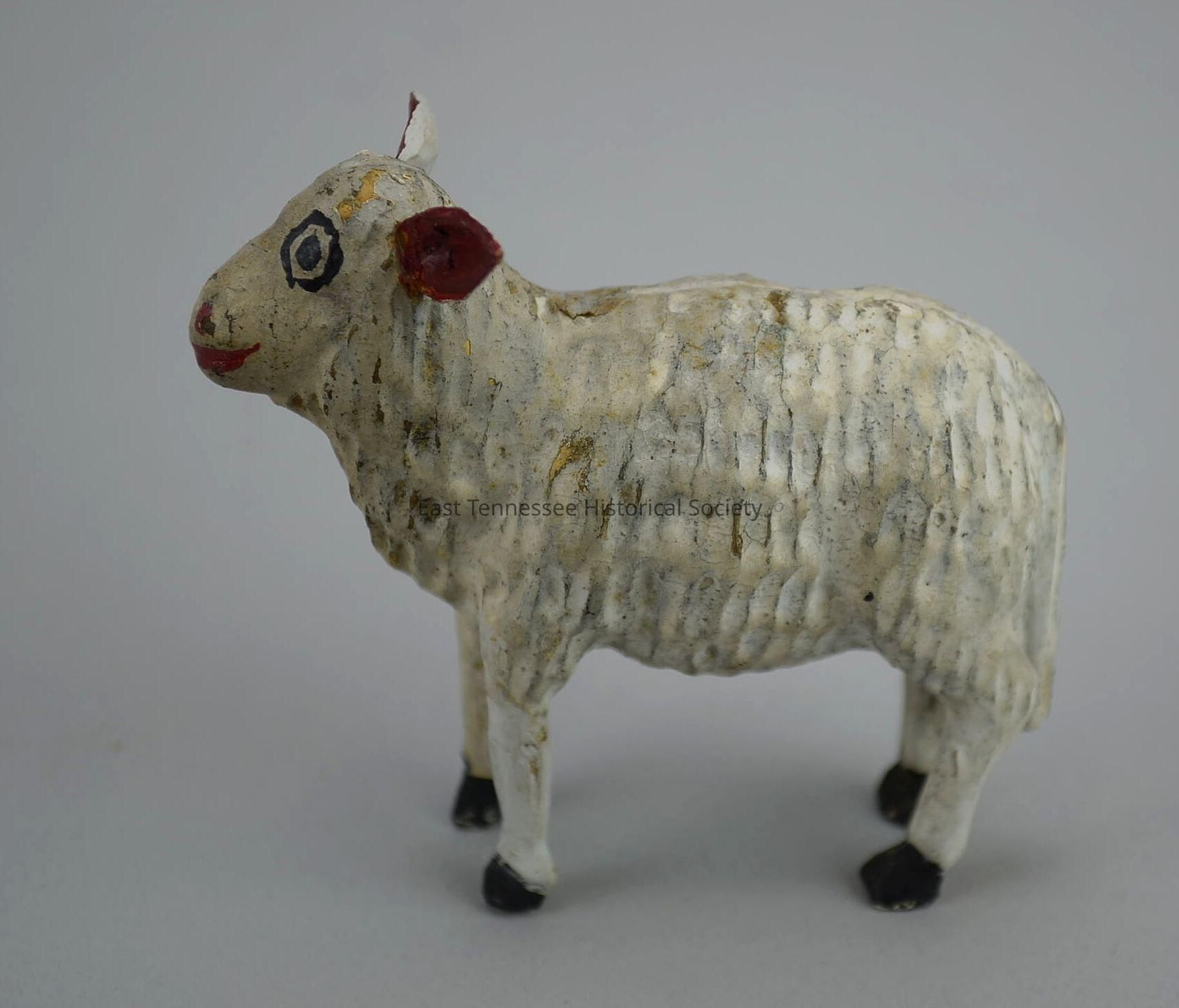 Carved sheep, white painted wood, dimpled fleece with short symmetrical vertical pattern, narrow groove runs length of spine, black eyes and surrounds, red mouth/nose/ears, black hooves, made by Hickey family, 2 5/8"h x 1 3/8"w x 3"d, 1730-1880.Made/Created