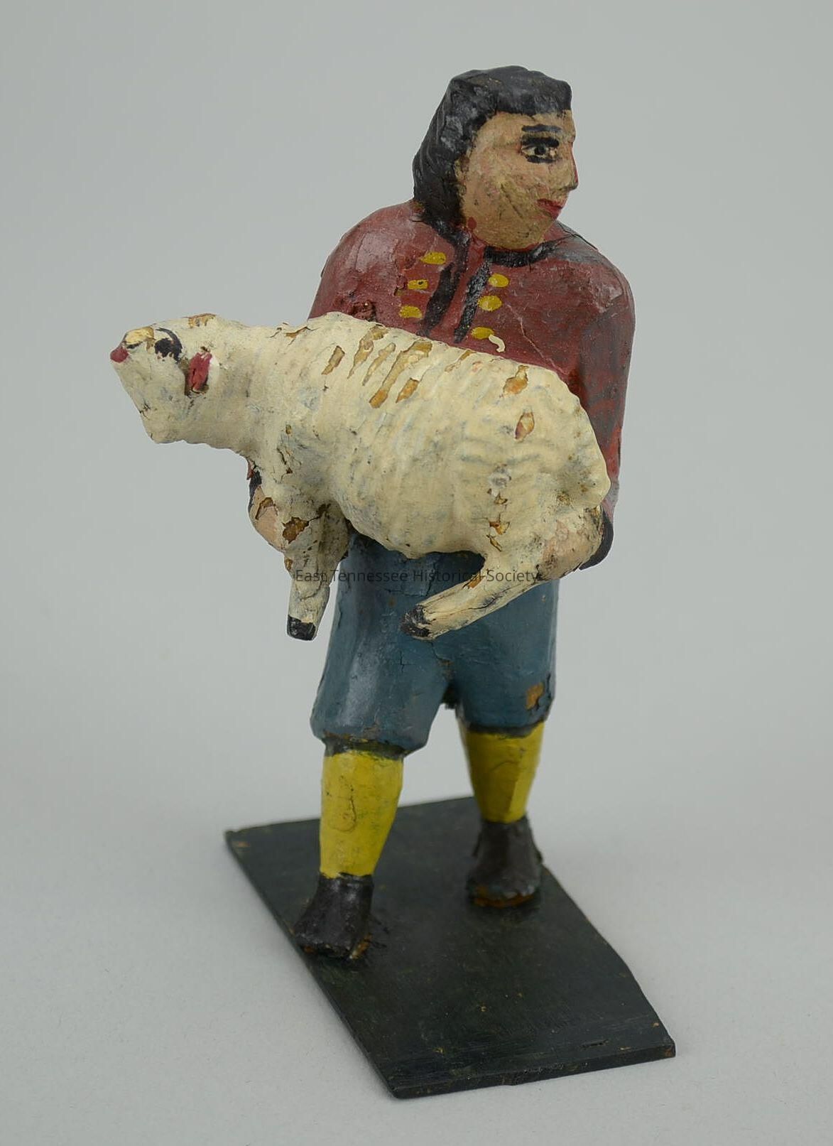 Carved figure of standing shepherd, painted wood, holds sheep with both arms at front mid-section, dark-brown hair, black eyes, red mouth, red jacket with black trim and gold buttons, , blue breeches, yellow stockings, black shoes, sheep with red mouth and black facial features, black base, made by Fickey family (Germany), 4 1/4"h x 2 7/16"w x 2 11/16"d, 1780-1880.Made/Created