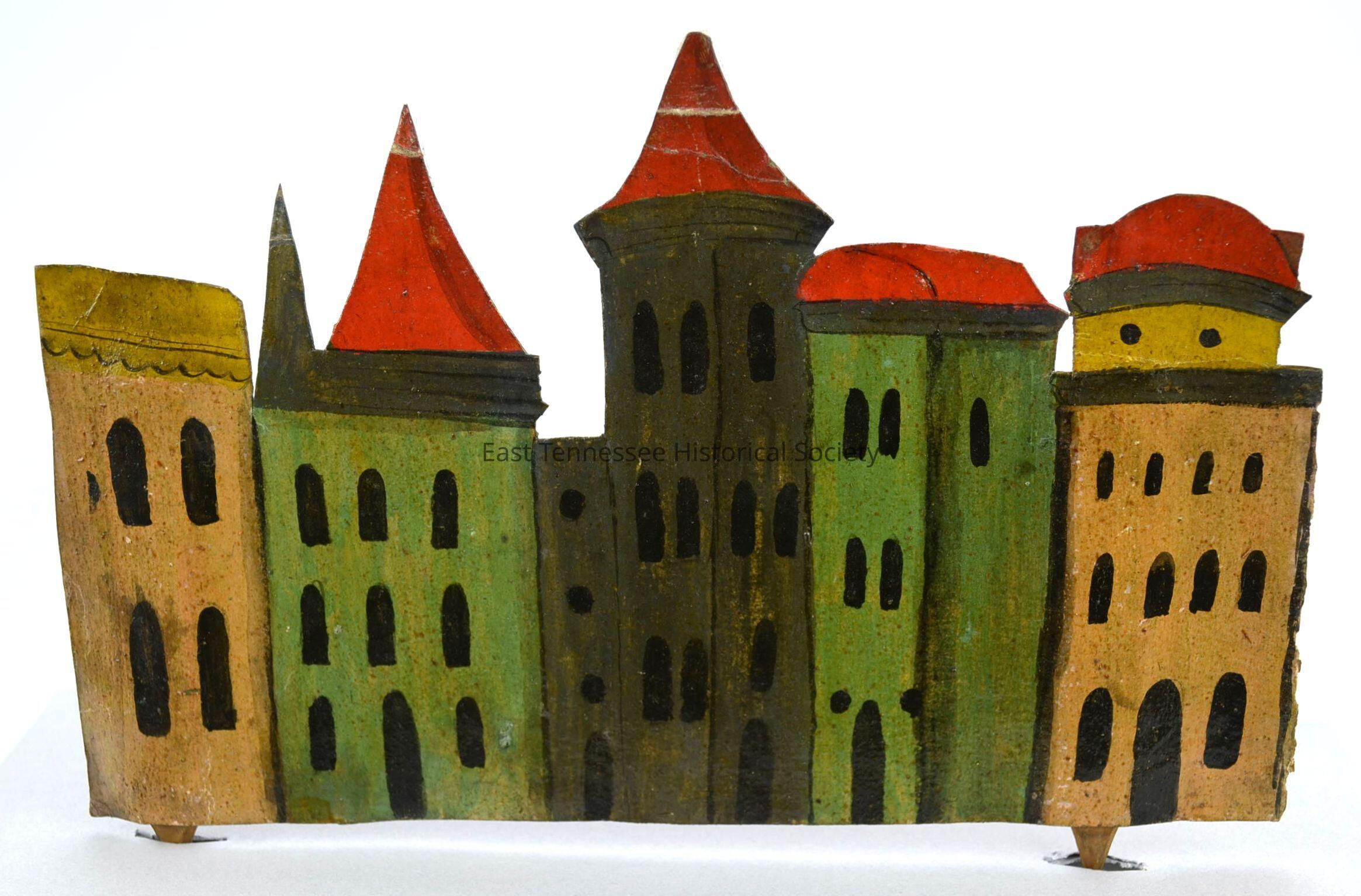Backdrop, painted cardstock/hard paper, scene of five buildings; from left-tan two-story building with flat gold roof, green three-story building with two roofs (one red, one black), dark-gray three story tower with red roof, green three-story tower with red roof, tan three-story building with gold cupola with red roof, made by Hickey family (Germany), 7 1/4"hx 10 1/8"w x 3/16"d, 1730-1880.Made/Created