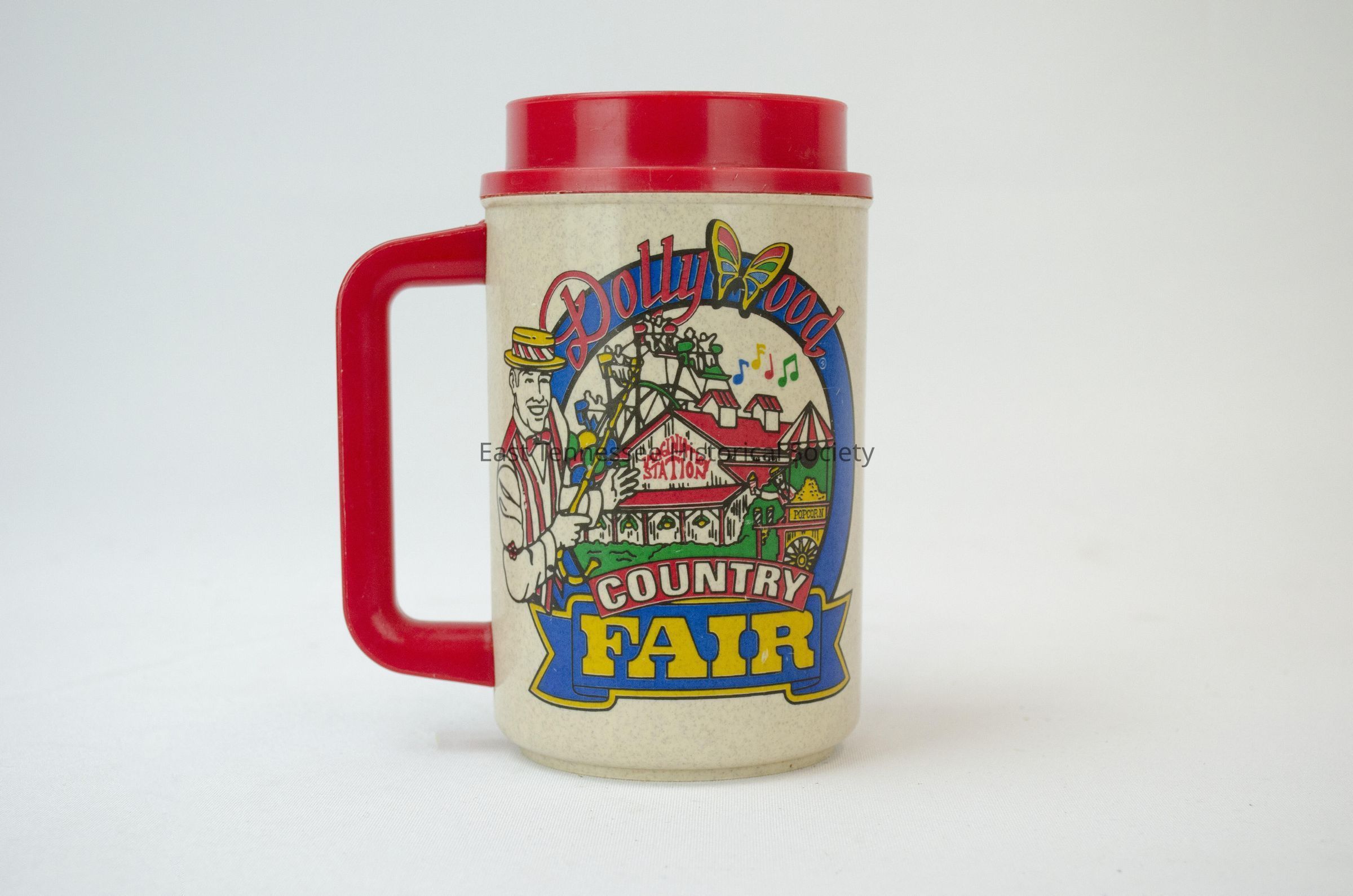 Thermal beverage cup with handle from Dollywood, rigid cream-color plastic with red lip/handle/interior and five-color illustration, marked "Dollywood [in red on blue background, the W being a butterfly] / COUNTRY [in white on red background] / FAIR" [yellow on blue background] on two opposite sides with logo showing carnival worker at left and barnlike structure marked 'Imagination Station" at center with Wonder Wheel behind, popcorn stand at lower right corner above COUNTRY, base marked with recycling emblem/"THERMO"/"HOT!/COLD!"/WHIRLEY INDUSTRIES INC./WARREN, PA U.S.A..," 6 1/2"h x 5"w x 3 1/2"d, c. 1993.Made/Created