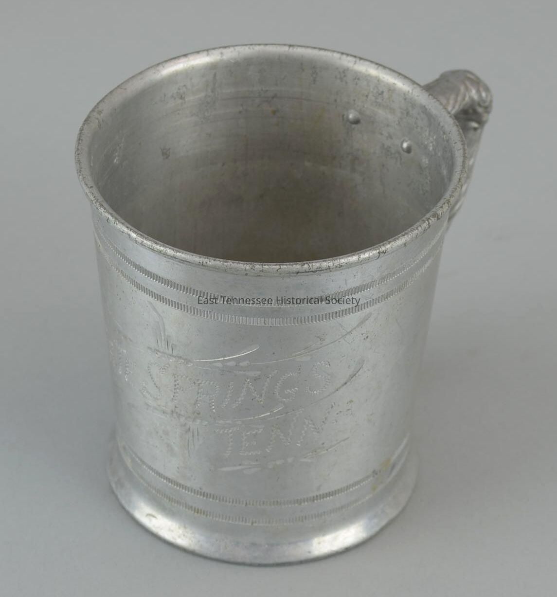 Cup, aluminum, twig-like handle attached by rivets, double band of etched vertical-hashmark rings at top and bottom, etched "TATE SPRINGS / TENN" in between (side opposite handle), 3 3/8"h x 4 1/2"w x 3 1/8"d, date?