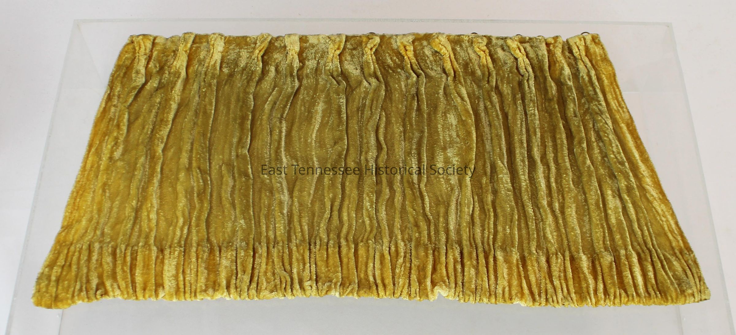 Small-size curtain for child's stage set, gold crushed velvet, gathered and pleated, metal rings across top back edge (for hanging, 10" x 36", c. 1935.Made/Created