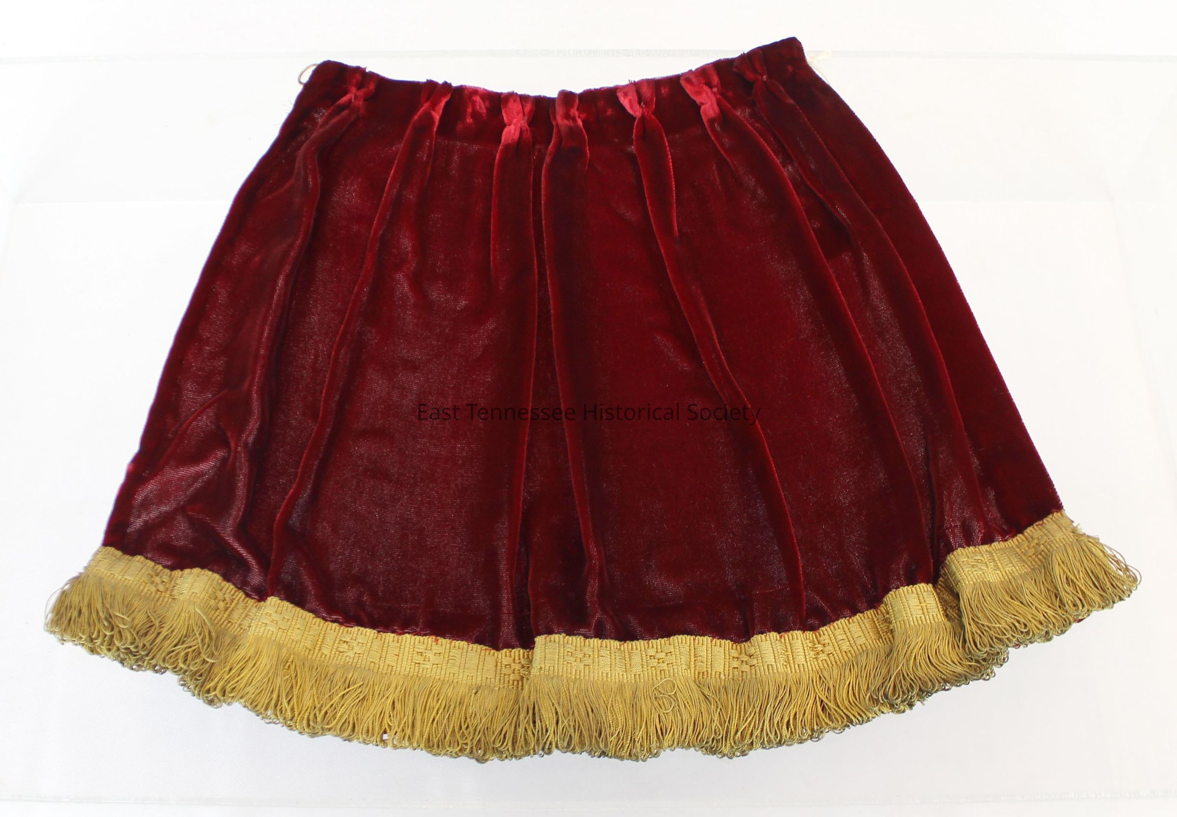 a) wine-red velvet, gold fringe along hem, pleated, metal rings for hanging along top back edge, 11"h x 17"w.