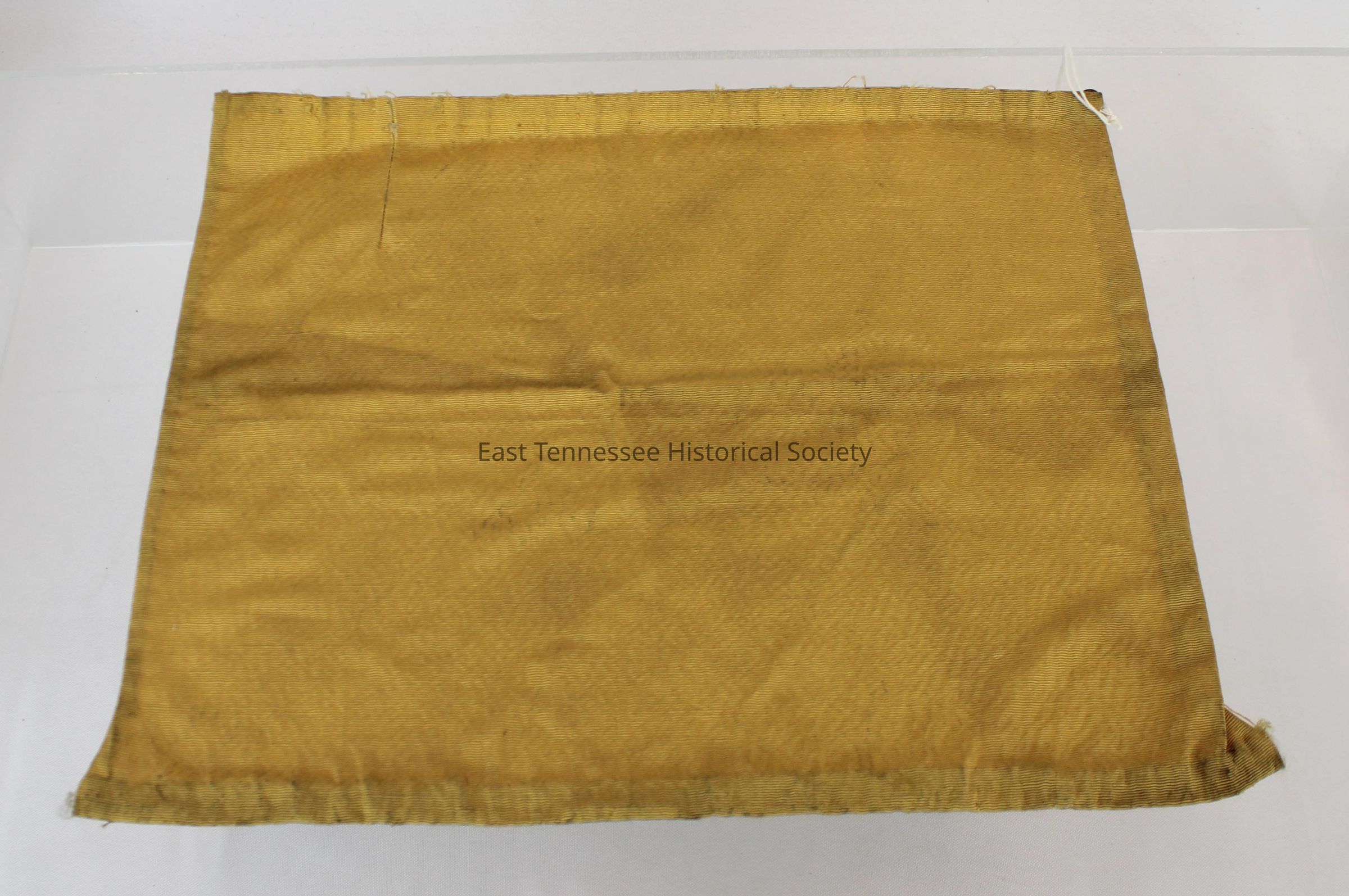 a) Gold faille backdrop curtain, one metal ring at top right corner for hanging, weighted hem, 11"h x 13 1/4"w.