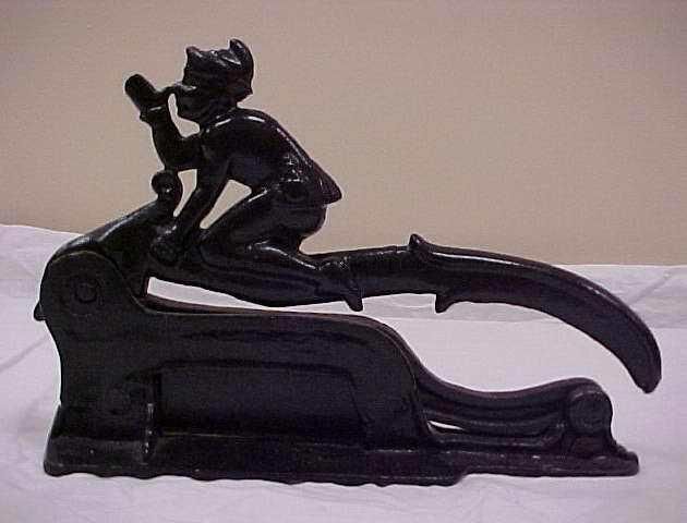 Tobacco cutter (store), iron. Painted black. As lever is lifted a gear lifts blade. When lever is lowered so is the blade. An elf or gnome figure sits a top lever and decorates the cutter. Small opening in back of cutter. Most likely where devise could be fixed to a flat surface by a screw or nail.Collection