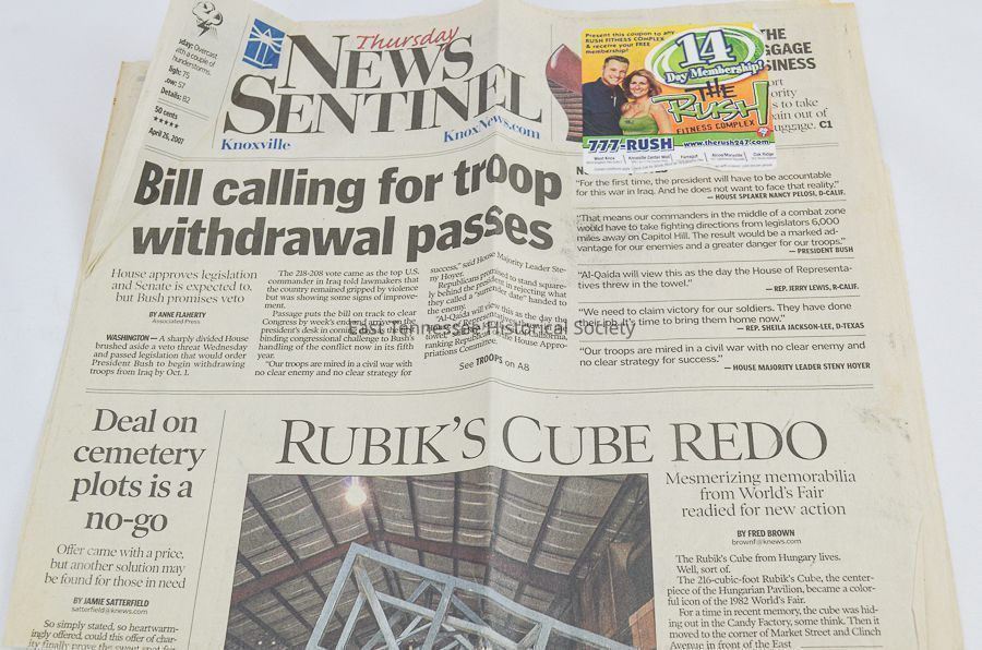 "News Sentinel" newspaper, "Knoxville", April 26, 2017. Headline reads "Bill calling for troops to withdrawal passes"