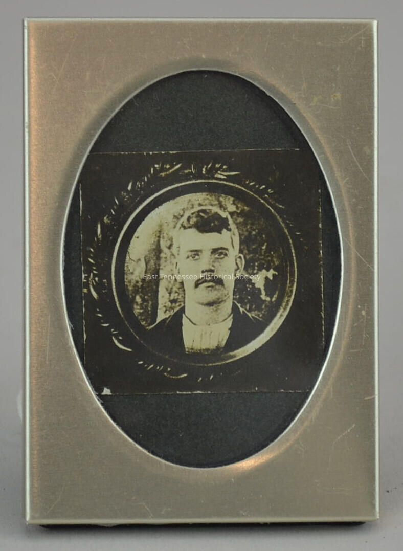 a) Small b&w photograph of David Dezern, face portrait in the round of young man with moustache and hair cropped closely on sides, wears collarless white shirt and dark jacket, image bordered by wreath-like detailing most apparent around left side, 1 5/8" square, c. 1902.