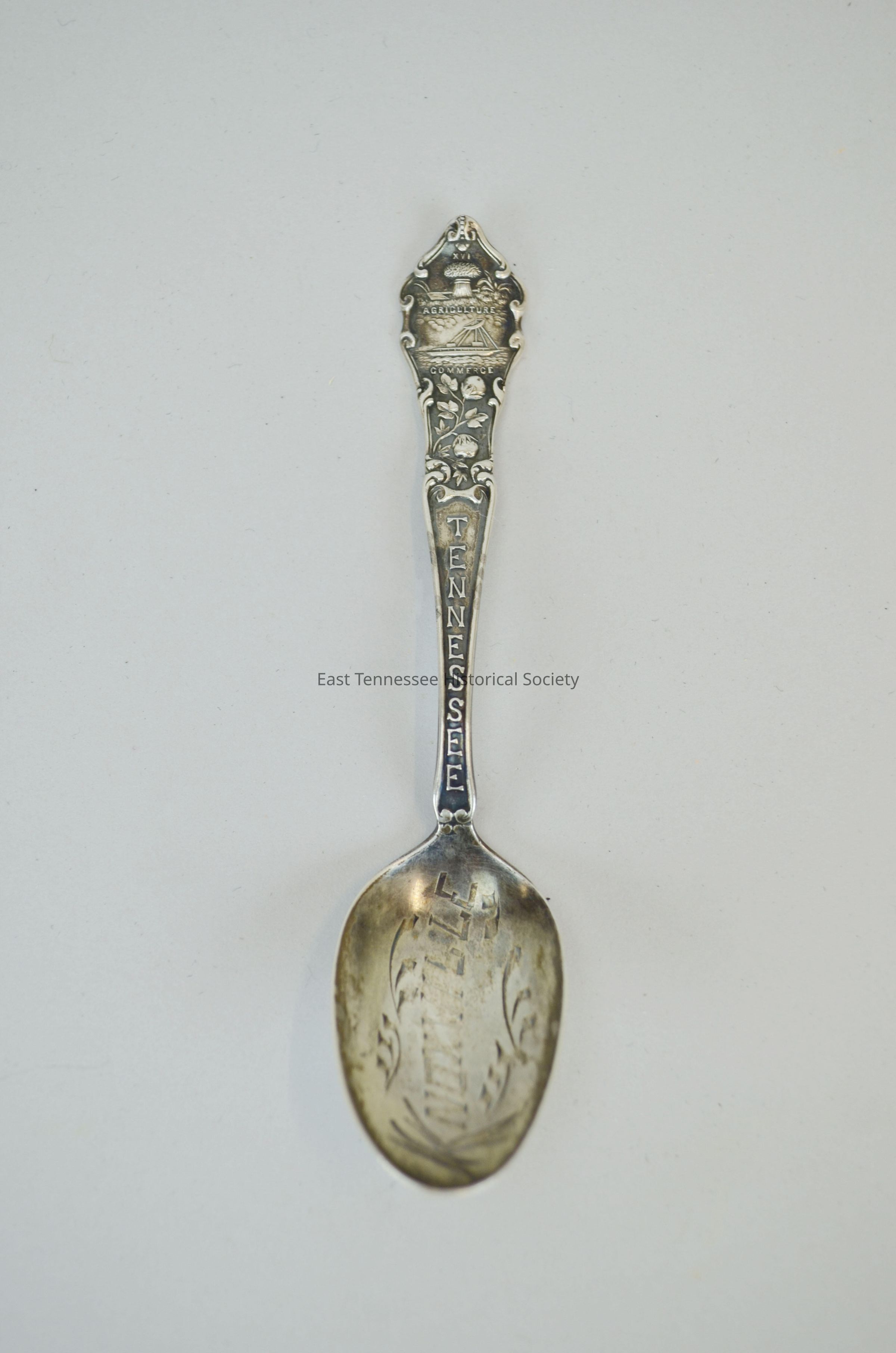Souvenir spoon, handle front top marked "XVI (with image of bundle of wheat and plow below)/ AGRICULTURE (with image of boat below)/ COMMERCE" and a vertical presentation of "T/E/N/N/E/S/S/E/E" to the narrow part, bowl marked with "KNOXVILLE", back features an image of the state capitol building marked "STATE CAPITOL" (below), below features a man with a pickaxe, narrow part of handle marked "STERLING SSMC," 1 1/8"h x 5 1/8"w x 7/8"d.