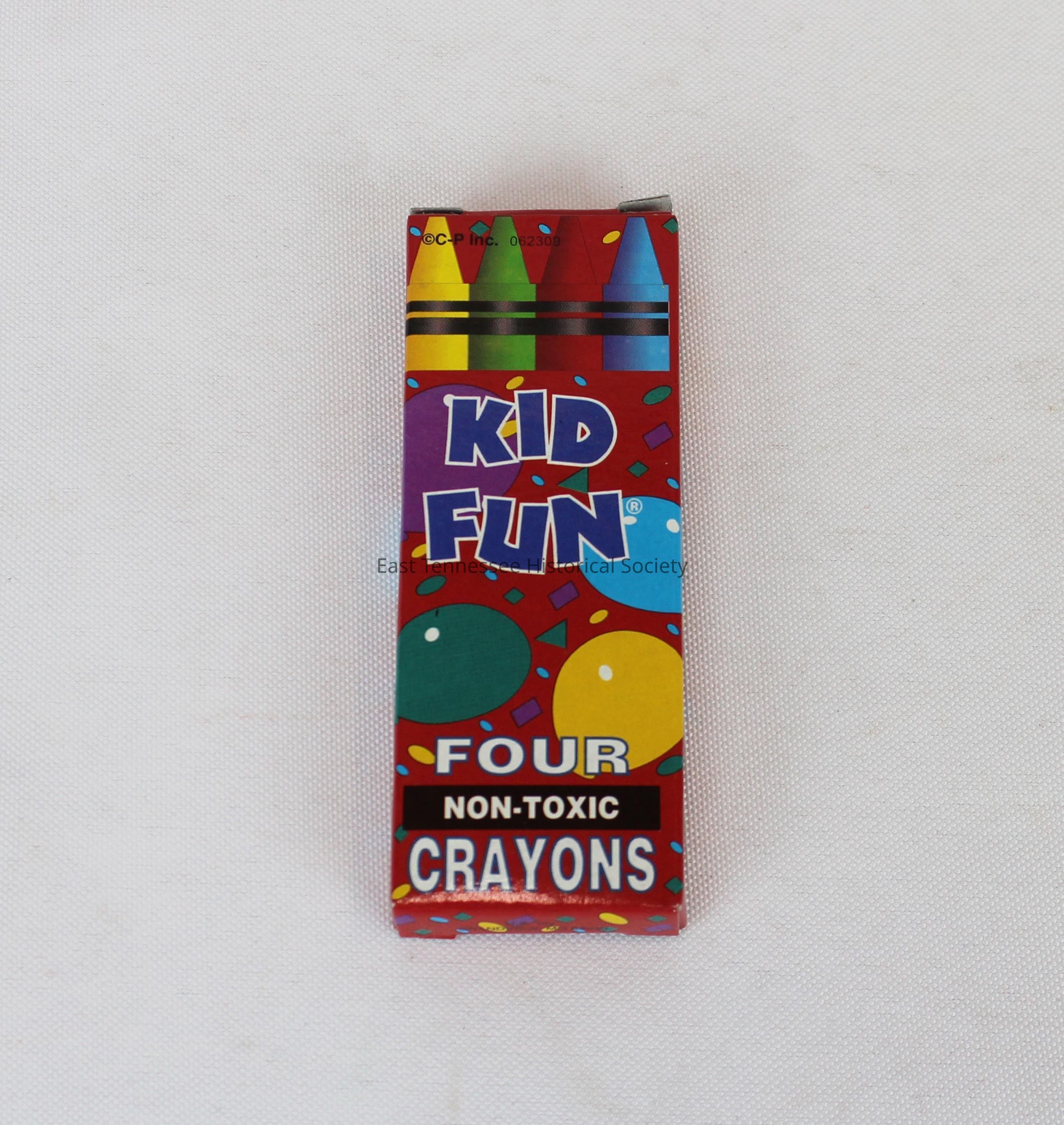 b) Four-crayon box, Taiwan, 3 3/4" x 1 1/2"w, c. 2010.