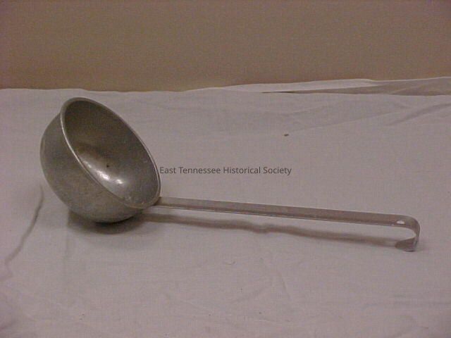 Long diagonal handle comes to a slight hook at the end. Small hole located at the top of the handle. Top edge of dipper cup folds over to the outside forming a lip.Collection