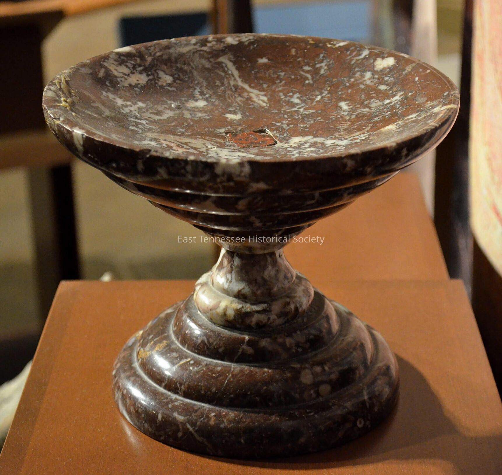 Liver-red marble footed dish--with history of being used as a calling card dish--made by John Hanson, hour-glass shape, sculpted top* and base with smooth, shallow bowl, unpolished bottom, approx. 8"h x 8" diam. c. 1861.