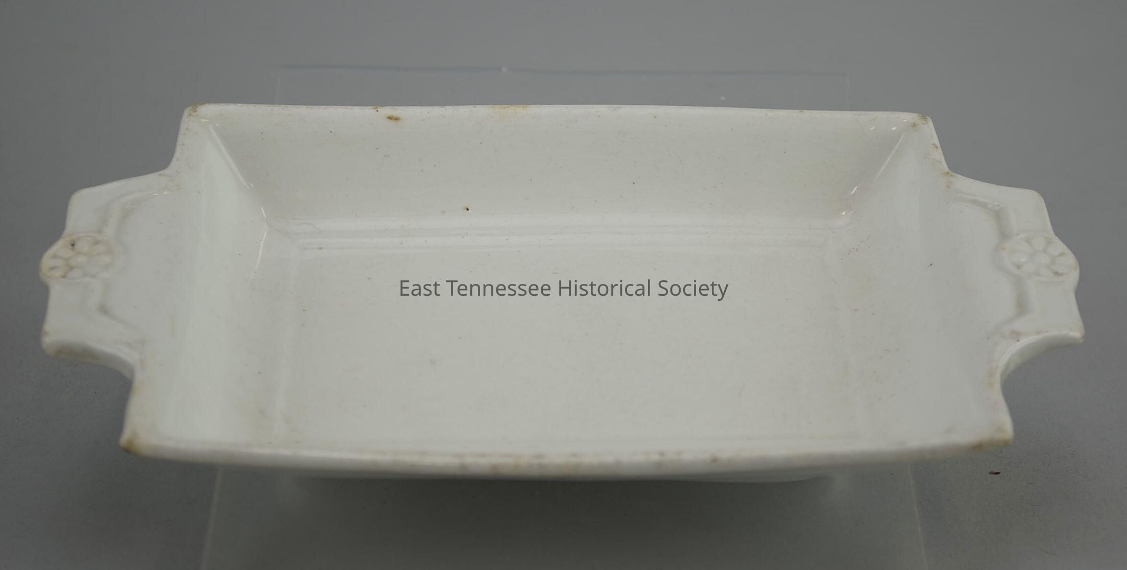 Butter dish used by Anna and John Kinsland, rectangular white ironstone/semi-porcelain, raised sides, rectangular handles with small embossed flower in circles, label on reverse marked "Premium Semi-Porcelain," manufactured by T&R Boote (England), 1 1/8"h x 7 5/8"w x 4 3/8"d, c. 1880s.Made/Created