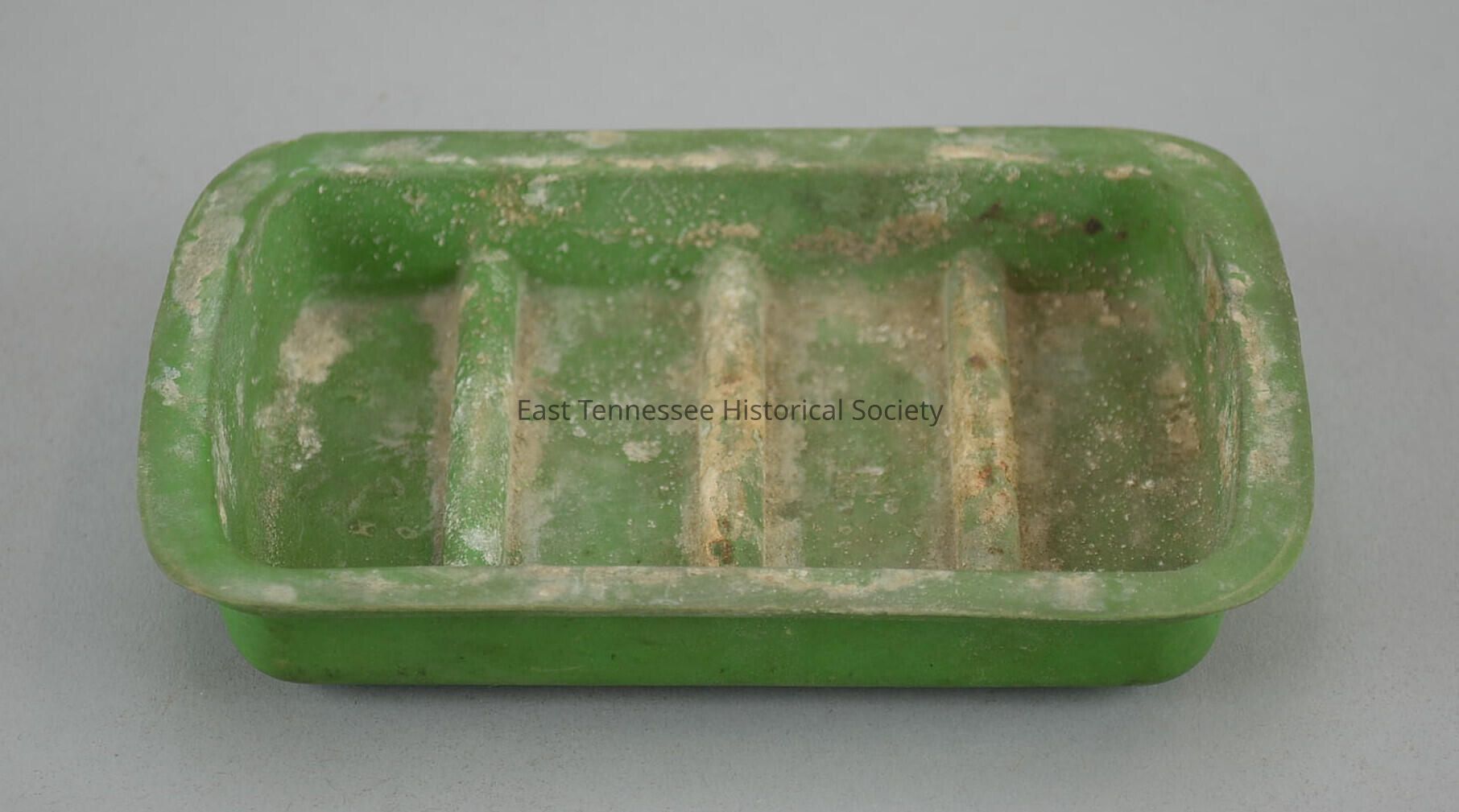 Soap dish belonging to Robert Barnes "Bob" LaForge Jr. (1885-1956), green plastic, four knobby feet, three raised lines on interior bottom, maker unknown, 3/4"h x 4 1/2"w x 3"d, c. 1917.Made/Created
