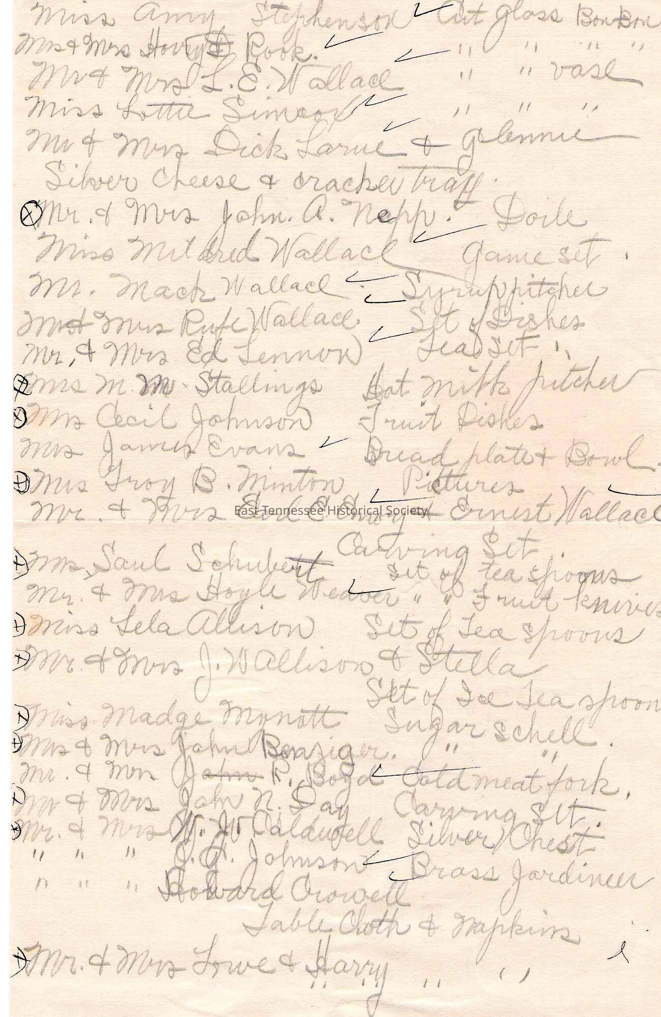 List of wedding gifts in groom Fred Wallace's handwriting, attached sticker reads "1912 Wedding Gifts/ (Fred's handwriting), 10" x 6 1/2".Made/Created