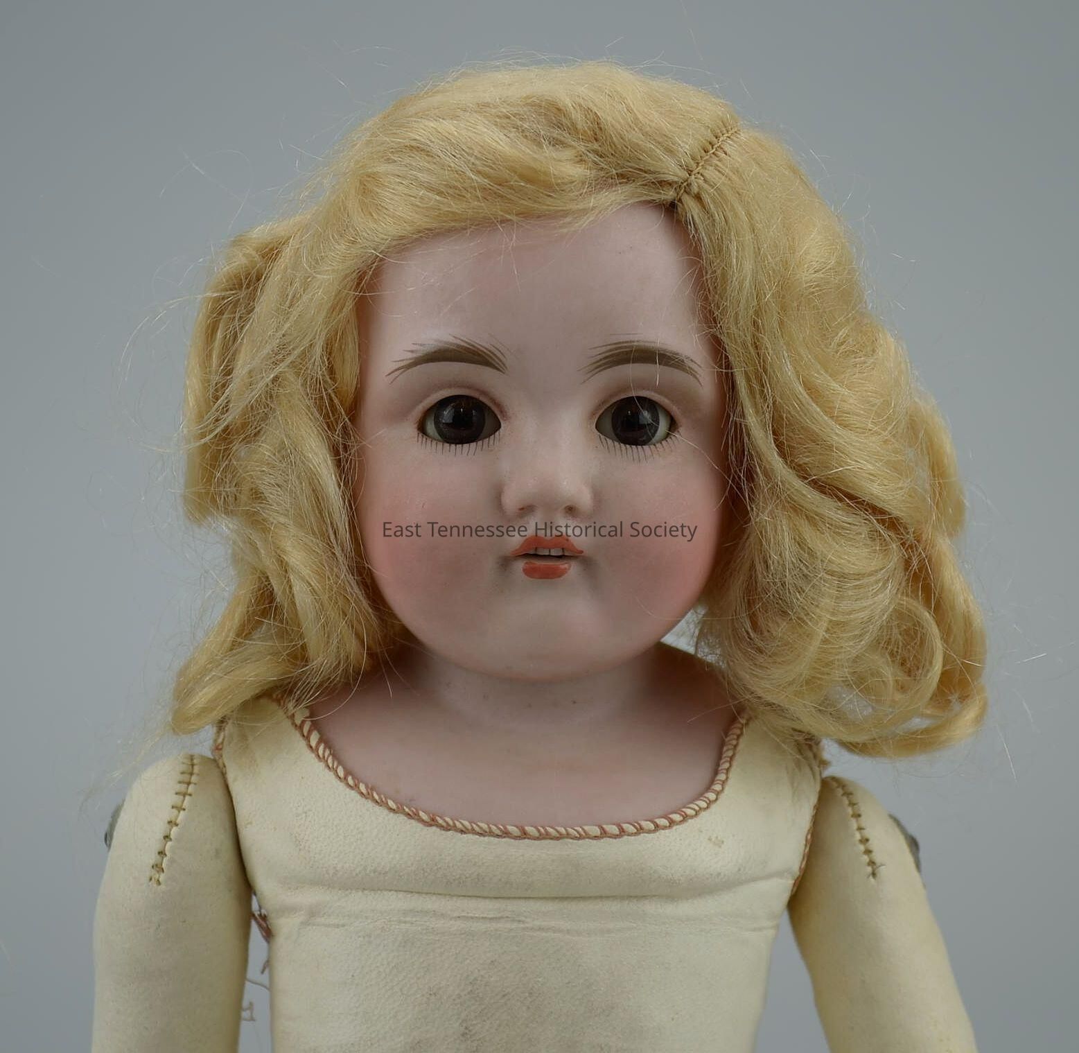a) Doll, bisque head and forearms, brown sleep eyes, slightly open mouth with two teeth, jointed kid-leather body/hinged at shoulder/elbow/hip/knee with metal wire secured to metal buttons, gauze/stuffed with excelsior, bisque hands, 20"h, marked "3" at head back, marked "Germany" on back with numbers 154 dep. 2 1/2 (and other hard-to-read words), 14 1/2"h x 4 1/2"w, c. 1911. Manufactured by Kestner.