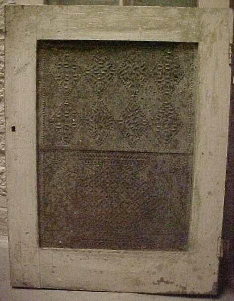 .2a-b) Pair of punched-tin doors (front or side?) with two tin panels each in 26 1/2"h x 19 1/2"w inset, diamonds (on point) punched in top tin, urn and six-pointed stars in bottom tin, white paint on front/brown on reverse, c.1832 (house built in 1832).