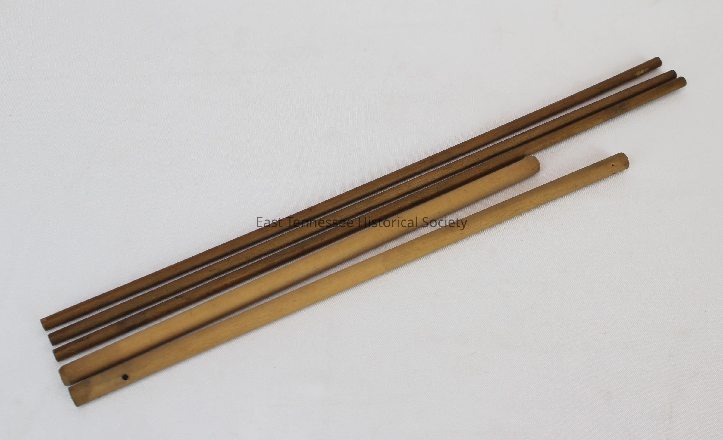 Wooden dowels (5)--three at 19" x 1/4", one at 13 1/4" x 3/8", one at 15 1/2" x 3/8", unknown manufacturers, c. 1935.