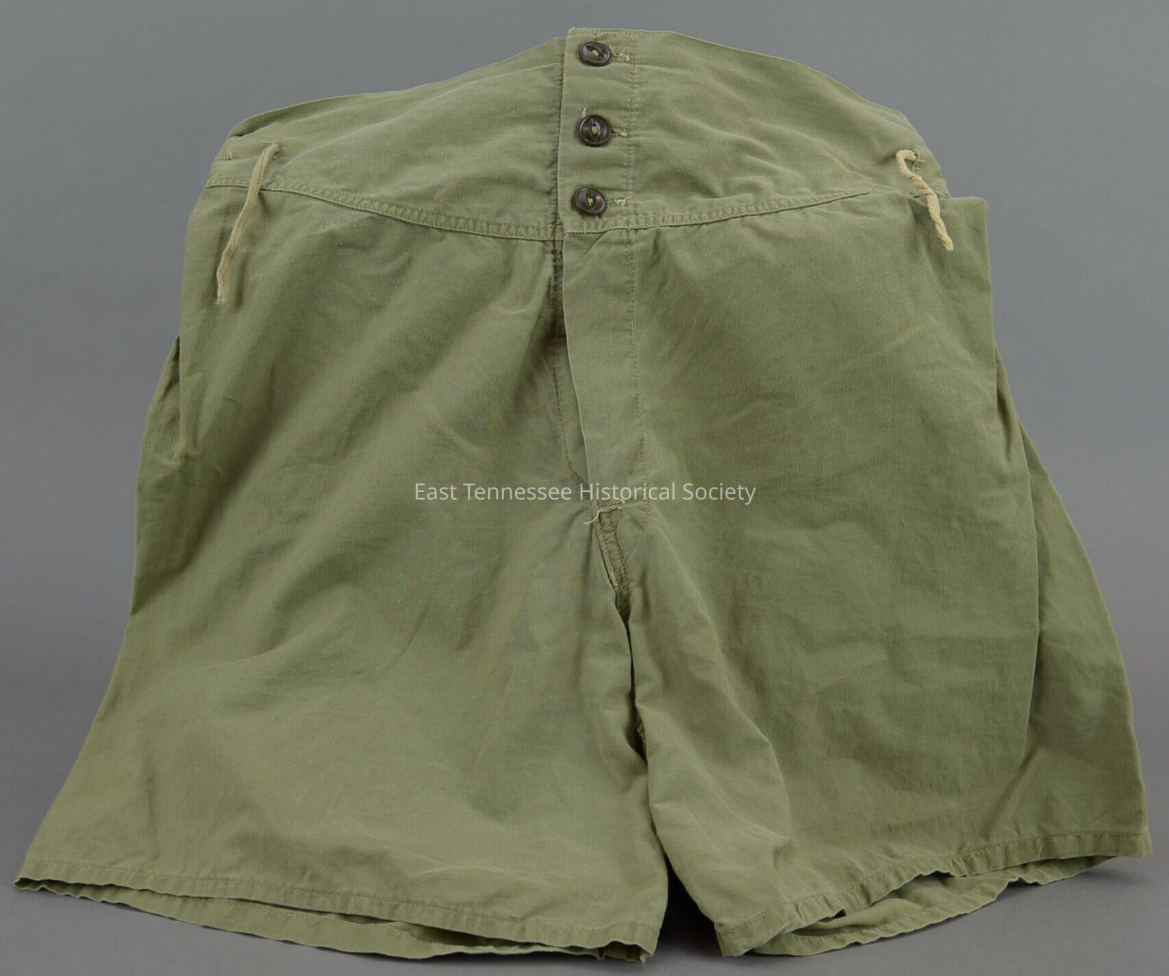 Military-issue underwear of Robert Mallory LaForge, drab olive green cotton, three-button front closure, 30" waist, front marked "RML 1501 / ?17?2" in black, interior back label stamped "SIDNEY WILENSKY - FEB. 27, 1945 / PO-16571 / U.S. ARMY SPEC. NO. 5-1830 [?, faded] / PHILA. Q.M. DEPOT / STOCK NO. 55-0-?0?" in black, tan drawstrings at left and right sides [to tighten waist],17"h x 15"w, World War II/1945.Made/Created