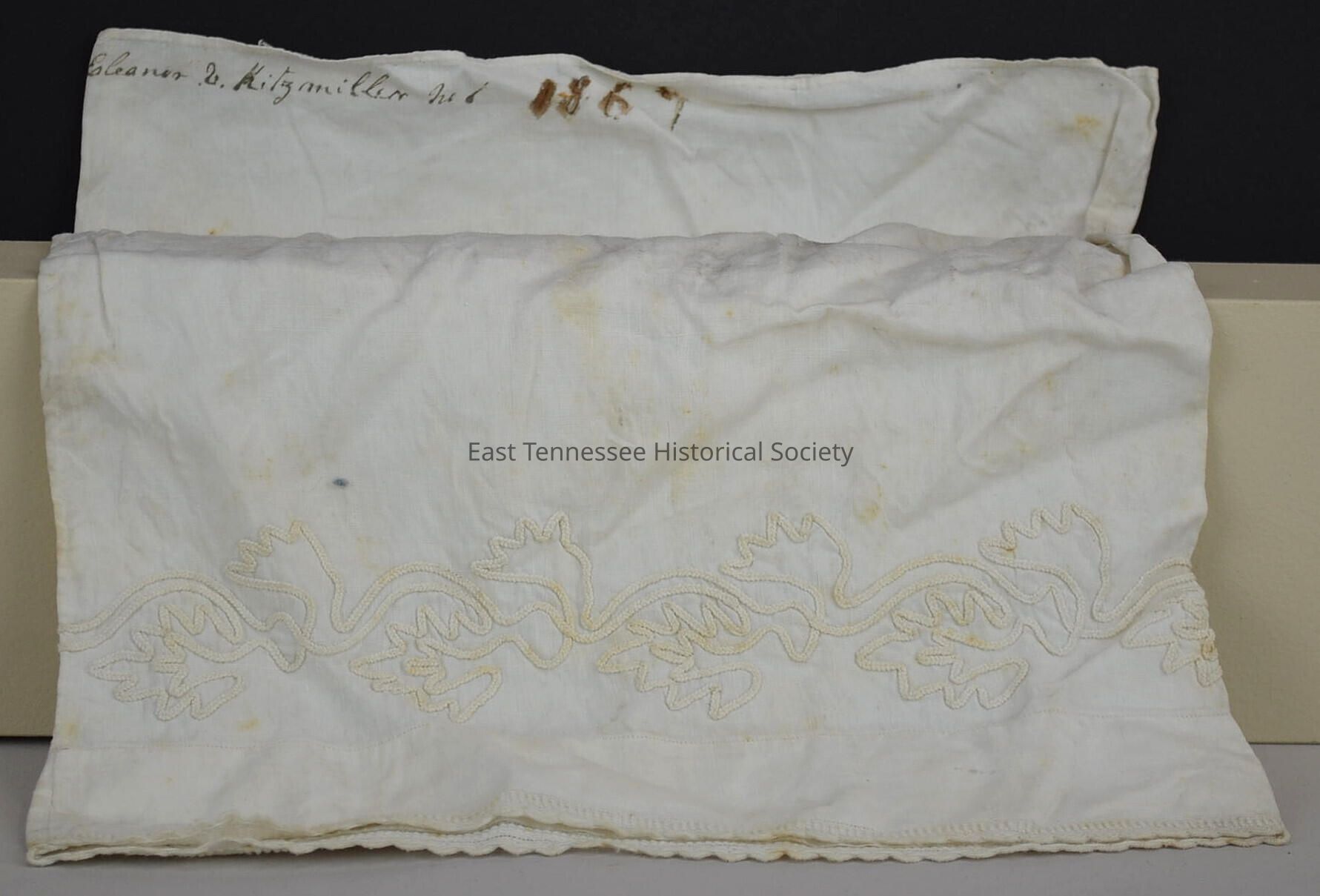 Leg from lady's drawers, machine sewn, braid work in vining leaf design 2" up from bottom edge, machine-sewn French seams and narrow braid-and-lace edging on bottom edge, "Eleanor V. Kitzmiller wed 1867" written in cursive on right side by seam, handmade/probably by Eleanor V. Bachman Kitzmiller, c. 1866-67.