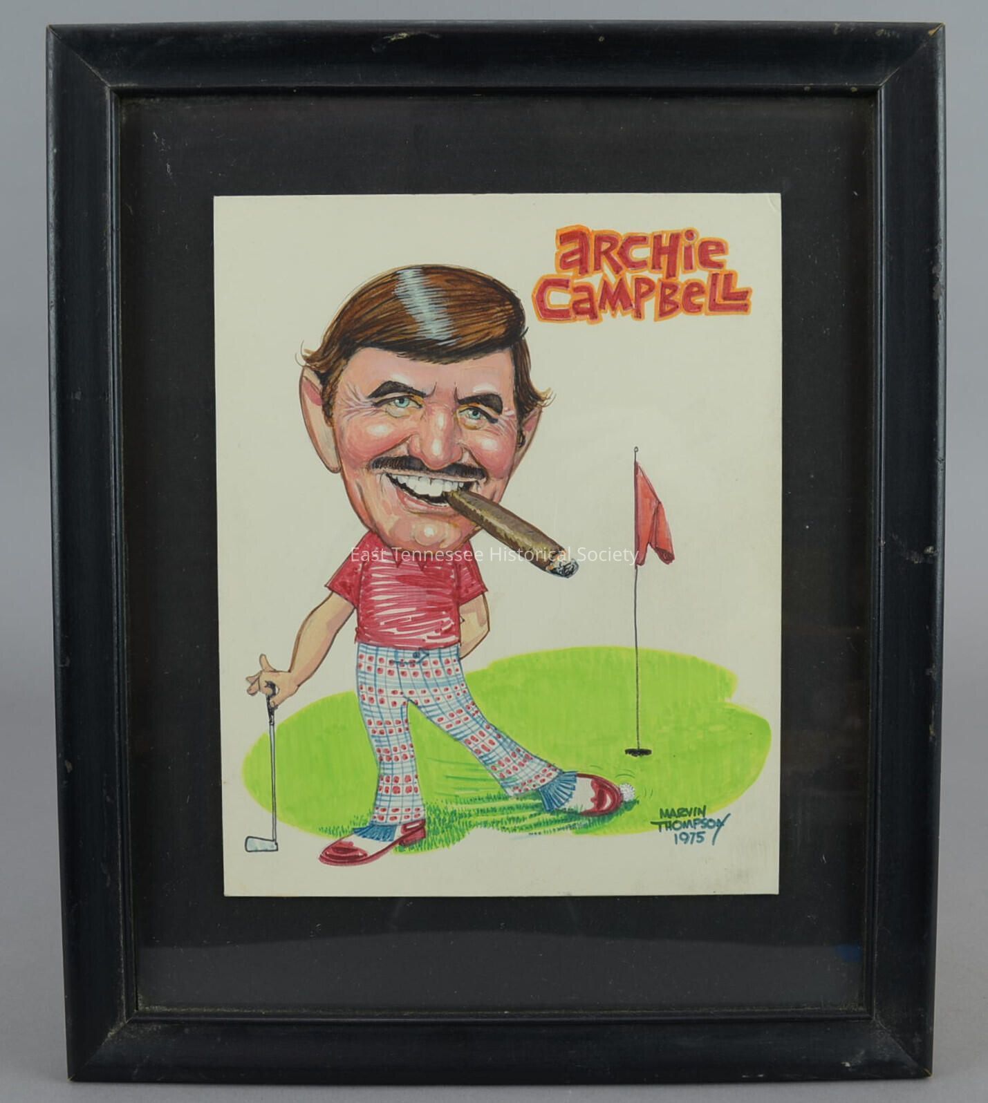 Caricature of Archie Campbell by Marvin Thompson, colored markers on paper, shows man with thick brows and moustache/brown hair and blue eyes/smiling with cigar in mouth/wearing red short-sleeve shirt and blue striped and red dotted pants/golf shoes with red fronts and blue fringe/holds golf club in right hand/nudges golf ball toward hole with left foot/putting green with red-flagged pole in cup, marked "archie campbell" in red outlined in blue at top right and "MARVIN / THOMPSON / 1975" in blue at lower right. Black-painted frame with cardboard backing and hanging wire, 15"h x 12 1/2"w x 3/4"d, 1975.Collection