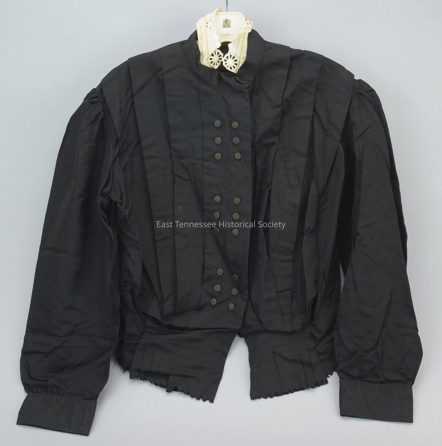 a) Black faille high-neck bodice, long sleeve, double breasted, fabric-covered metal button on center panel (three sets, total of six buttons), tucks at waistline, front and back sewn to indise band, hidden metal hooks and eyes at front closing, 23"h x 17 1/4"w.