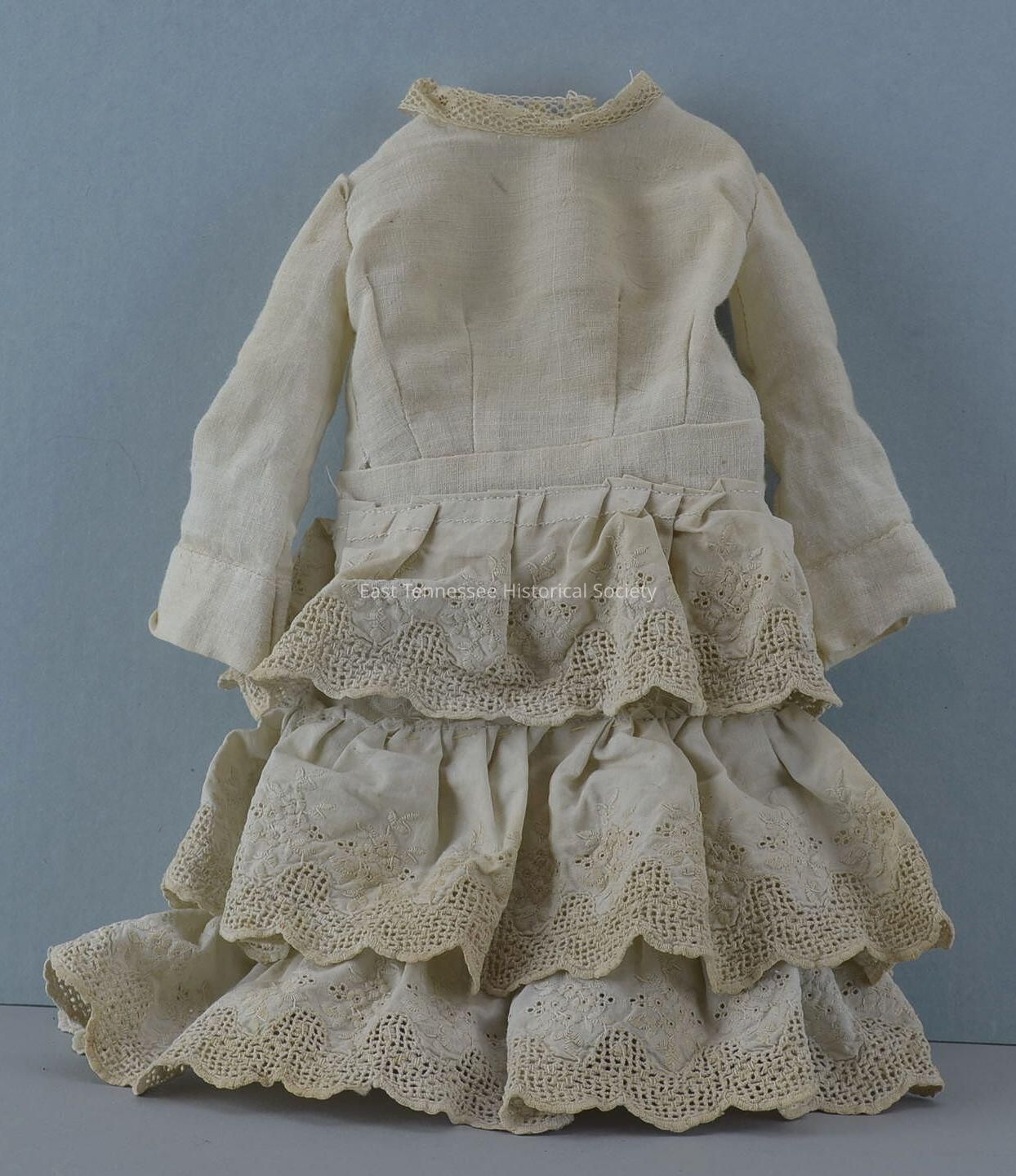 Dress for doll (probably not original), cream-colored linen fabric, lace detailing around neckline in high collar Victorian style, pleated bodice, three-tiered eyelet lace skirt with scalloped edges, arms folded into cuffs, three-snap closure at back, hand and machine sewn, 11 3/4"h x 6 1/4"w, Victorian/date unknown (c.1882?).Made/Created