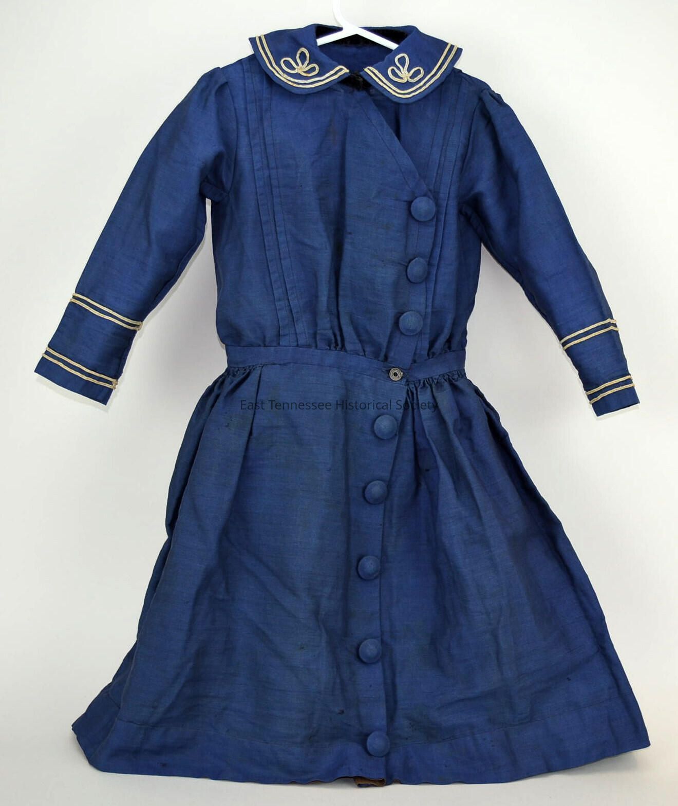 Girl's dress of Mamie Leora Solomon, royal blue linen, round collar with tan cording sewn around in two lines with three loop decoration at front, long sleeves with two double lines sewn 2" apart at edge, off-center closure with covered (self fabric) buttons down entire front, two small pleats on each side of bodice front from waistband to over shoulder to back waistband, skirt with flat panel at front and gathered rest of way around, hem faced in light greenish-brown fabric (used on .2 and .4), handmade/likely made by Mary Jane Tolbert Solomon (mother), 31"h x 12"w, c. 1910.