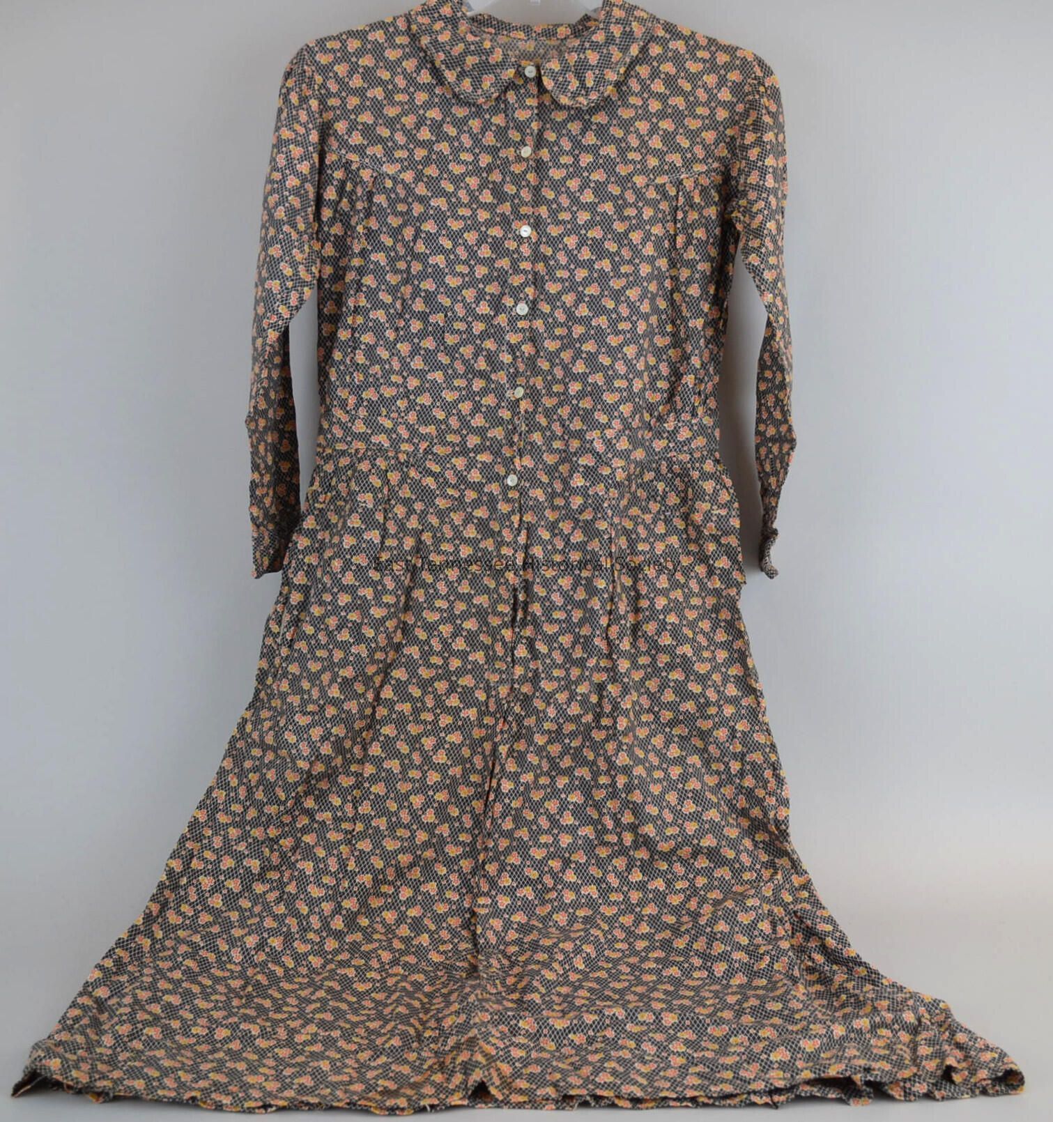 Dress made by Sarah Jane Foust Jones, floral cotton print with dark background/tiny line-diamond shapes in white/scattered orange dots and orange and yellow five-petal flowers in twos and threes, Peter Pan collar, placket front with six mother-of-pearl buttons (hand-sewn holes) sewn to waistband and extends into skirt without buttons, long sleeves, rough hand-sewn slash pocket on proper right side 2 1/2" below waistband, bodice and skirt pleated onto waistband, faced back hem, machine stitched, 47"h x 36"w at hem, 17"w at shoulders, probably 1920s*.