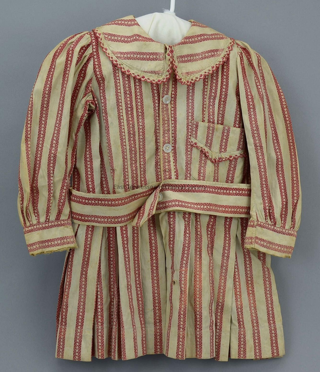 Boy's dress worn by Frank L. Rouser, cotton, vertical red-print stripe with tiny birds and dots on white background, medium-wide/Peter Pan collar and proper left breast pocket edged with red and white hand-embroidered eyelet trim, long sleeves with cuffs, four white-button closure at front, self-fabric belt attached at sides and back with single white button at front, pleated skirt with box pleat at center front and back, machine sewn, 20 3/4"h x 10 1/2"w, 9 1/2"w at shoulder seams, c. 1903.Made/Created