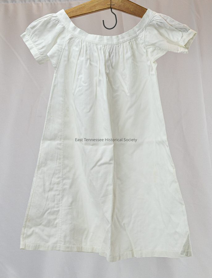 Handmade baby dress from the Henry and Margaret Vawter family, muslin, French seams, stroked gathers, gussets, hemming, w/o trim, early 20th century.
