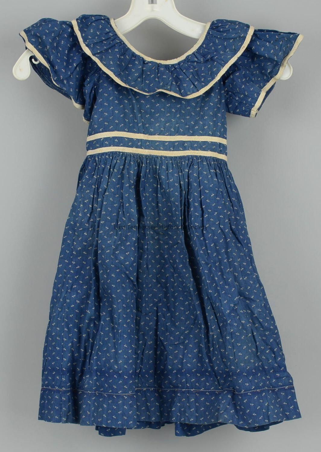 Child's dress, medium-blue cotton with small white geometric design overall, scoop self-fabric riffled collar with white tape trim on both edges, narrow sleeves with white tape trim, double row of white tape trim at fitted waist, very full gathered skirt with 2" machine-sewn hem, back button closure (buttons removed) on bodice with handmade button holes, open placket on skirt, trench seams, hand and machine sewn, 24 1/2"h x 8"w, c.1894.Made/Created