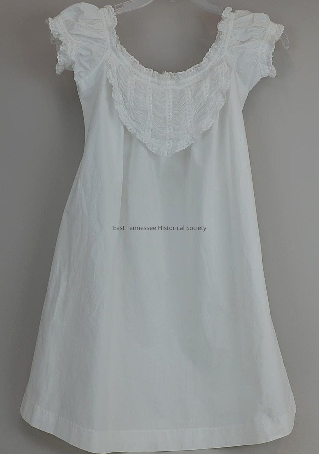 Child's dress, white cotton with lace trim, pouf short-sleeve with wide neckline, eyelet lace flat and scalloped gathered trim at sleeve ends and neckline, 10" x 5 1/2" bib of gathered thin fabric between rows of flat eyelet lace edged with gathered scalloped eyelet attached to front under neckline trim, A-line shape with front and back neckline gathered, armholes faced to enclose seam, handsewn, 32"h x 39"w (11"w at shoulder), 1800s.Made/Created